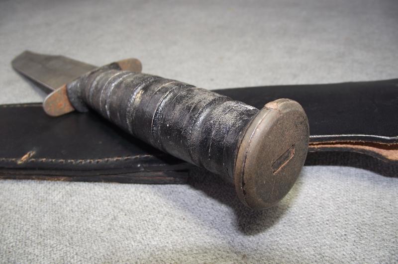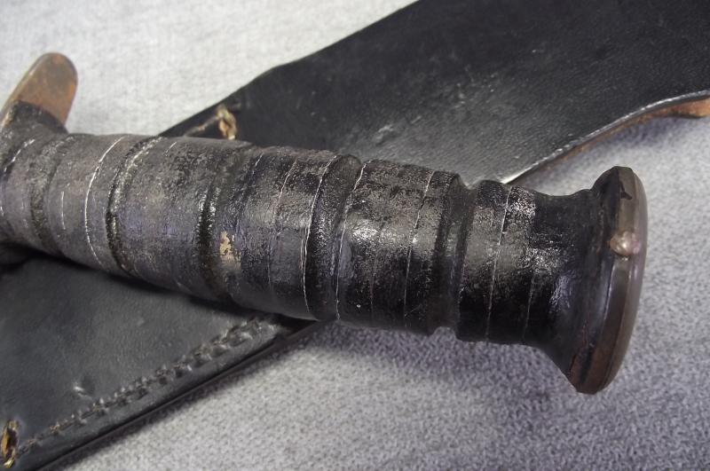 The blade has most of its factory finish and grind. Blade does not appear to have been sharpened still having its first factory edge, two minor dinks to the edge near the clip point. Clear makers details stamped to one side. The black stacked leather grip has no dry sections and has most of the finish. Pommel has good finish with securing tang pins to the side. The cross guard has some minimal rust bleed. The black leather scabbard is complete and supple with its top securing strap and working popper. This MK2 follows the WW2 pattern with straight cross guard being produced after Vietnam when Ontarion was given the contract.