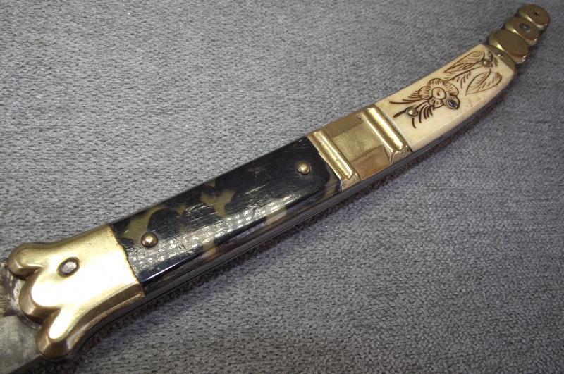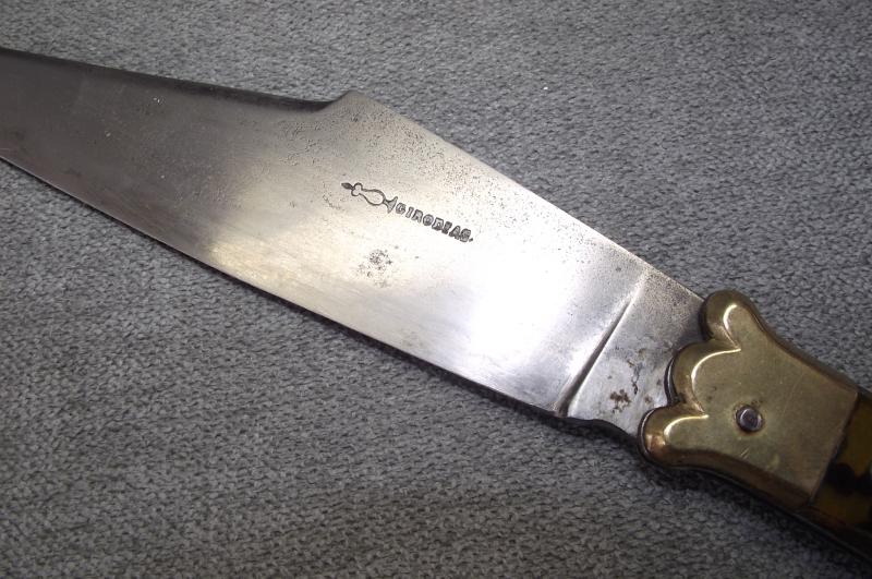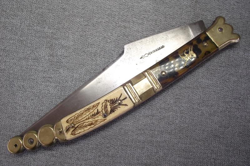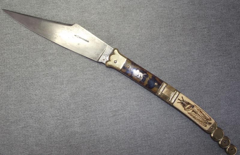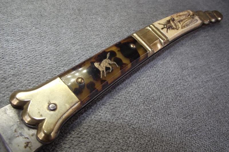 In very nice condition with the maker stamped blade with factory point having minimal staining and markings to the surface. The spring is tight. The mix of bone and tortoise shell handle again very clean with no cracks or ''dinks'', brass hilt fittings are in fine condition as well. A nice attractive example measuring just under 14 inches fully opened.