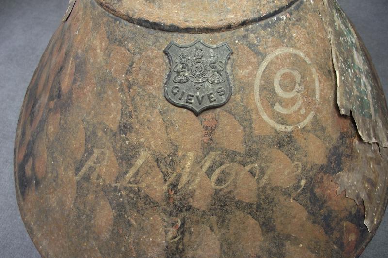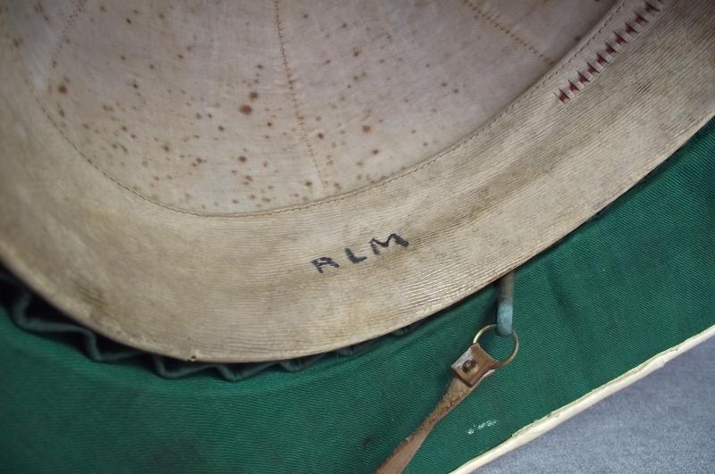 This nice condition helmet belonging to Captain Roderick Larken Moore has had a light coating of white finish, still bright with minimal marks, the folded blue RN pagri top has some fade. Inside again very clean with minimal foxing, clear makers details and marked by Moore with his initials . The green inner cloth is very bright with just some minor white from the outside finish, leather chinstrap is complete and supple. Top air vent is removable. The helmet comes with its ''japanned'' finished tin with Moore's name to the front and outfitters plate with some faded and ripped paper shipping labels. Included is the period padlock, sorry no key. There is plenty of information on Captain Moore on the internet, he was in the Gazette during WW1 after receiving a promotion for his solid action on board HMS Onslow during the Battle of Jutland. I've found one other mention in the 1945 Gazette for promotion to Captain and the award of his C.B.E. Im sure there is plenty more information to be had so a perfect research project if wishing.