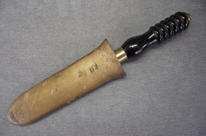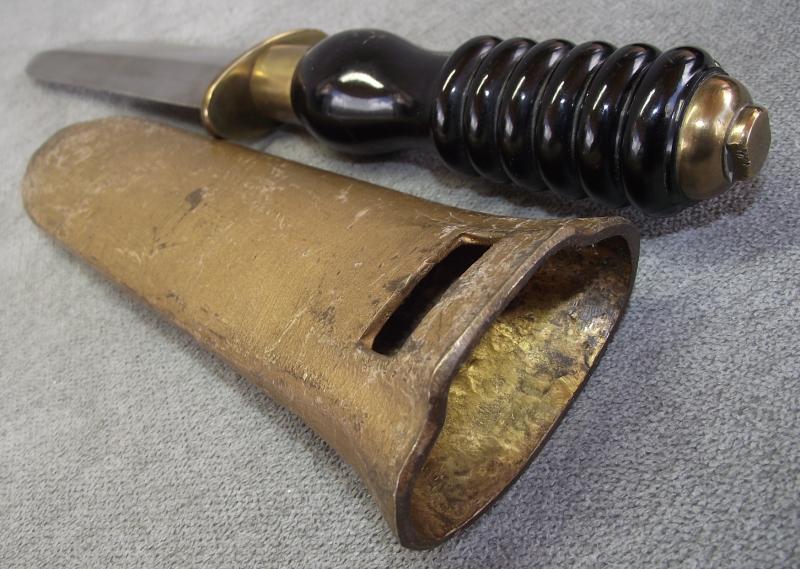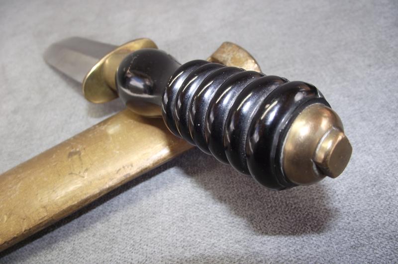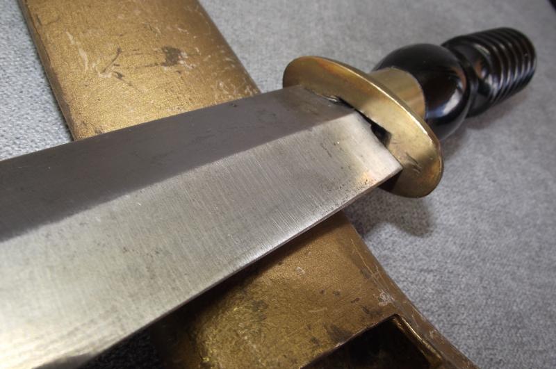 The condition of this 1970's production divers knife is very good with the magnetic blade having is factory edge and finishing grain. The handle is in nice condition with no chips or cracks. Solid brass cross guard and pommel. The brass gold painted scabbard in nice condition, blade fits tightly.