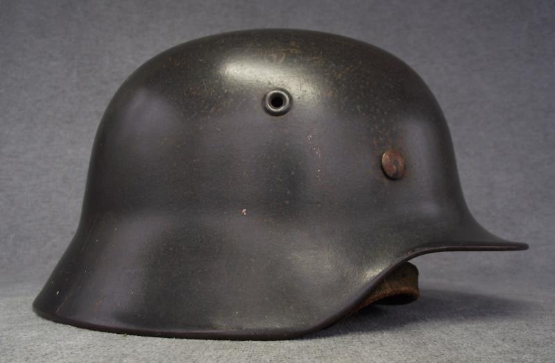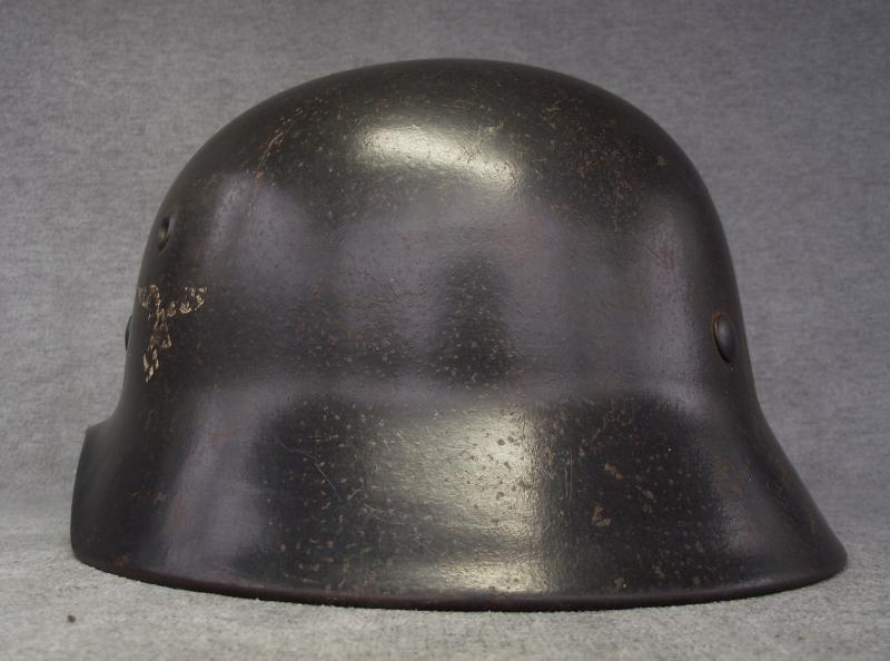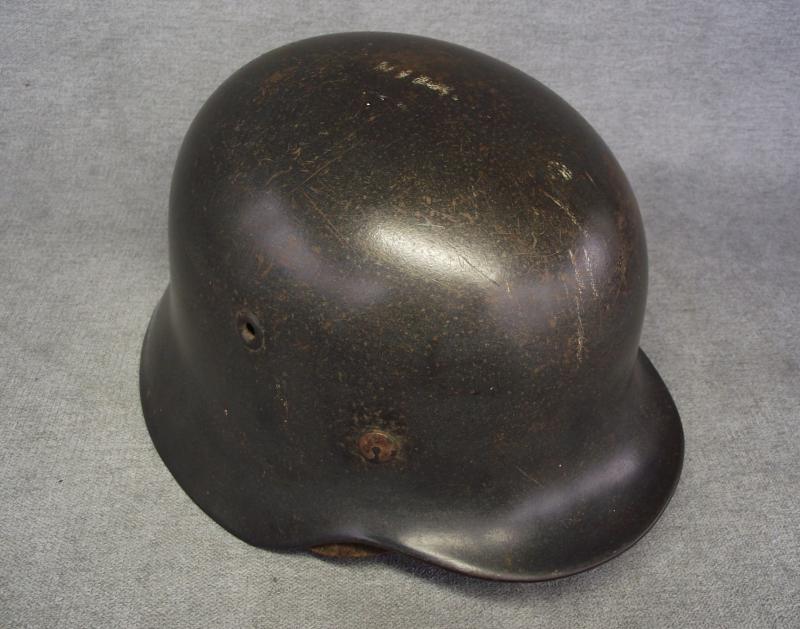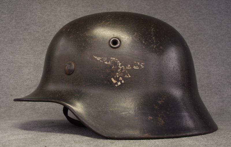 The shell retains well over 95% of its period factory finish with just some slight spotting from storage peaking through over the shell. One liner pin has all its finish with the other two having wear. All three pins are factory tight and unmolested. The side has the remains of a first pattern Luftwaffe Adler showing a good amount of wear, more to come on the decal at the end of the description. The period installed M40 type liner with steel band is supple with what i would call moderate use with some staining and wear to the edge. Two of the rear tongues have some rodent damage including a couple of nips to the leather body. The leather chinstrap is in nice supple condition with no damage and a steel buckle with most of its factory grey finish, no markings or date but in my opinion this is the helmets period chinstrap and not replaced. Shell has a clear ET64 stamp to the side with a Lot number 840 to the rear. I purchased this helmet many years ago from a chap who stated his relative brought this helmet home from Norway, found in an abandoned Airfield. The decal in my opinion is period and a type found for sale commercially and not factory applied. Norway is know for many anomalies when it comes to German helmets, this decal application might well be such. Anyway what your buying is a very nice Lufty helmet with nearly all its finish, tight unmessed liner pins, period liner and chinstrap. If like me you can see a period applied decal then your winning even more.