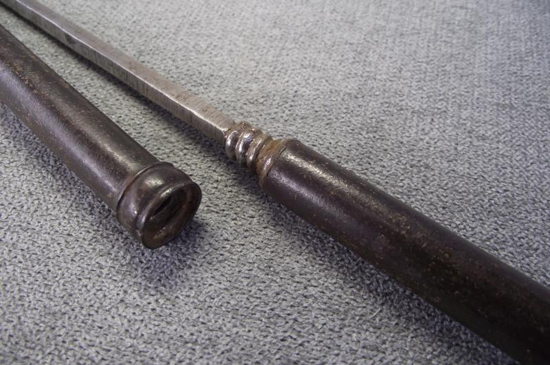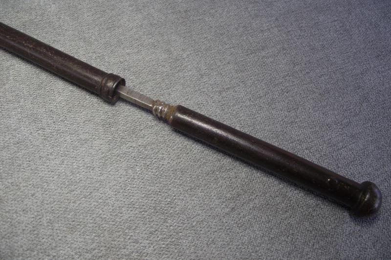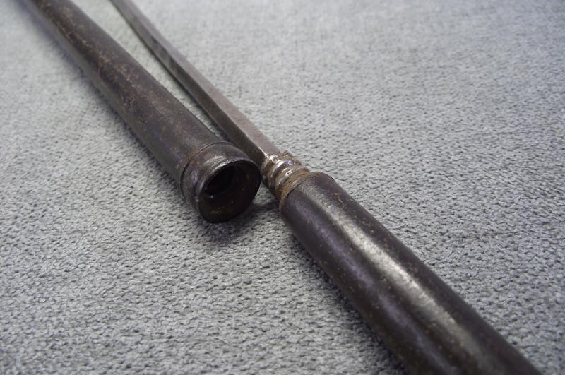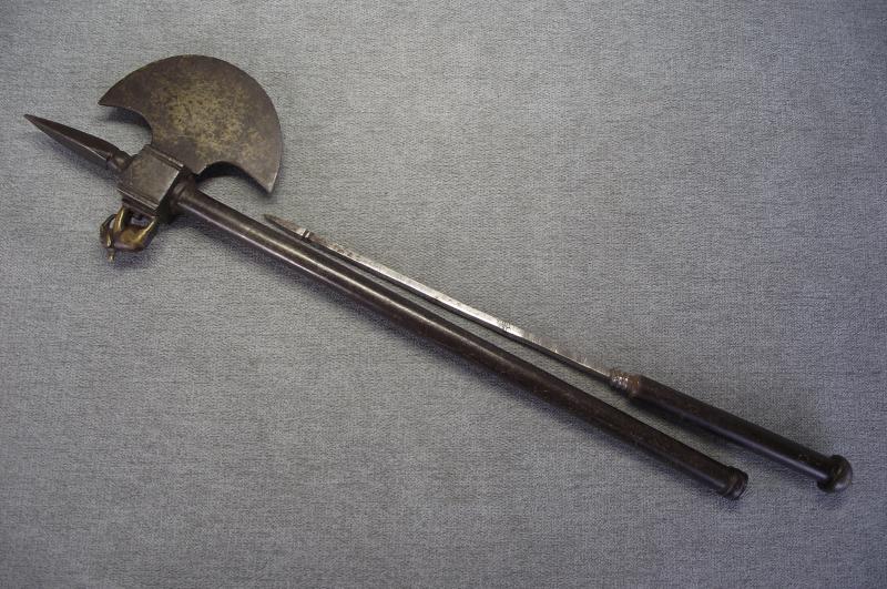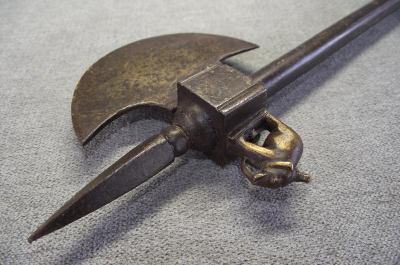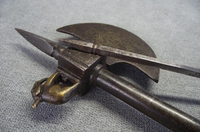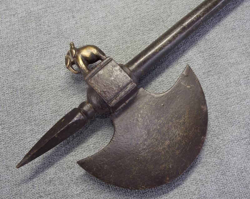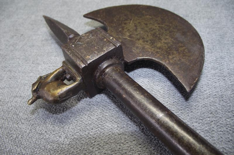 From tip to end this axe measures just over 20 inches. Condition i would rate at very good with no damage to the half moon head, slight dent to the spear point front and a nice detailed elephant sitting on top. The tubular shaft has no dents or splits, end screws out to reveal a second weapon. It all fits together very tightly with no rattle etc. As for period im not sure and im not pricing this as one owned by a former mogul king, just a very nice wall hanger. Please check the photos for better details. I've got a few on my stair case and in no need of anymore, unless this one does not sell then it will go with my others.