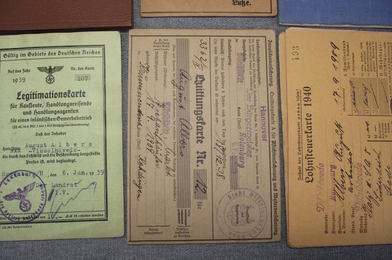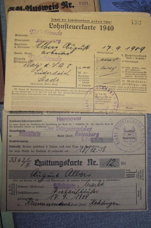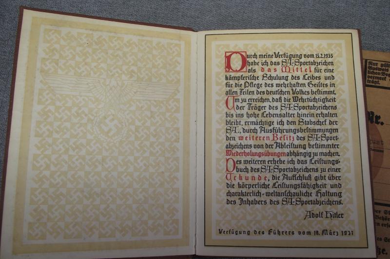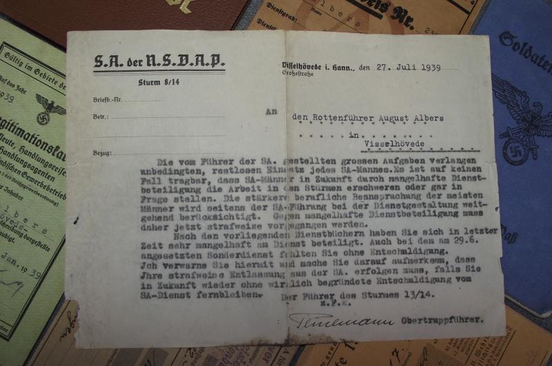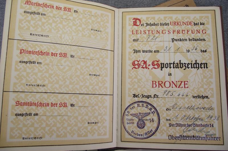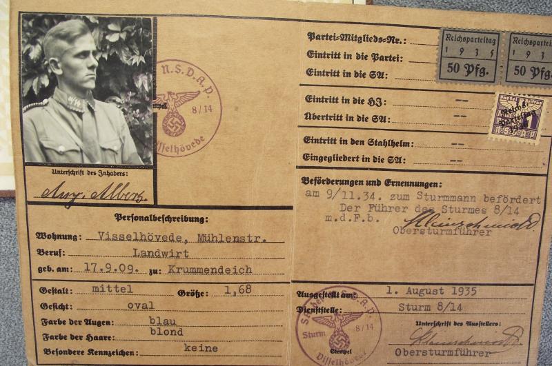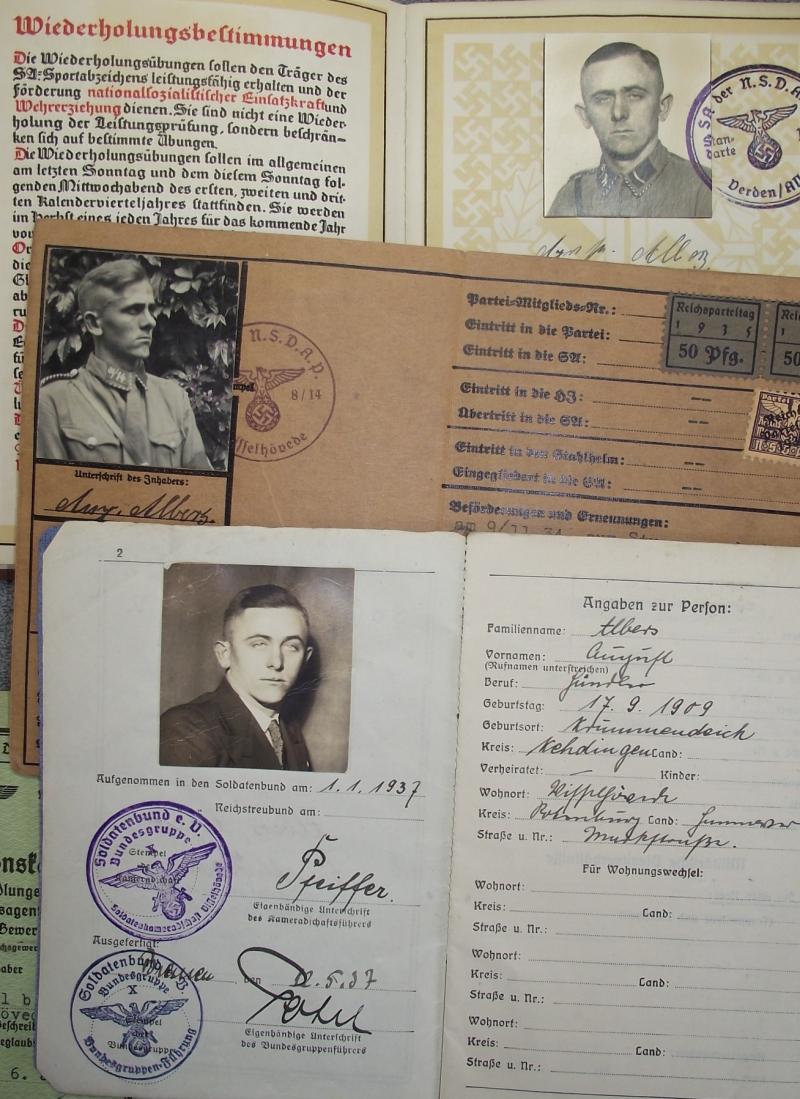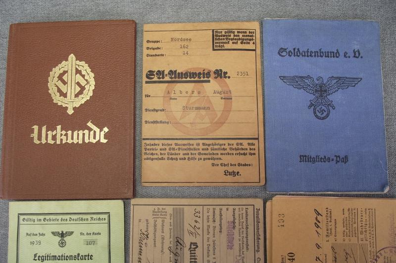 Nice little group of documents relating to a Sturmann Albers Augst from the Nordsee area of Germany. There are three different photos of Albers , Soldatenbund, SA Ausweis and the SA sprots Urkunde book. All four of his books are in very nice and complete with of course all relevant information. The other documents are related to Albers, again with full details.