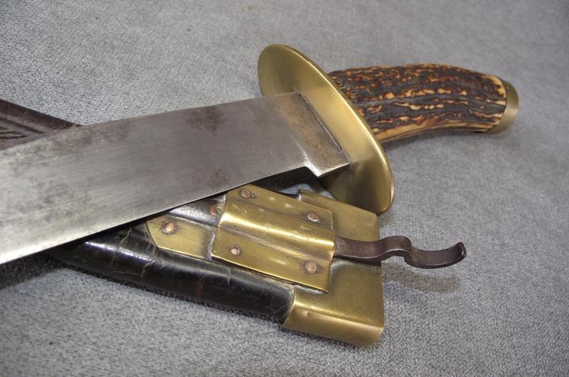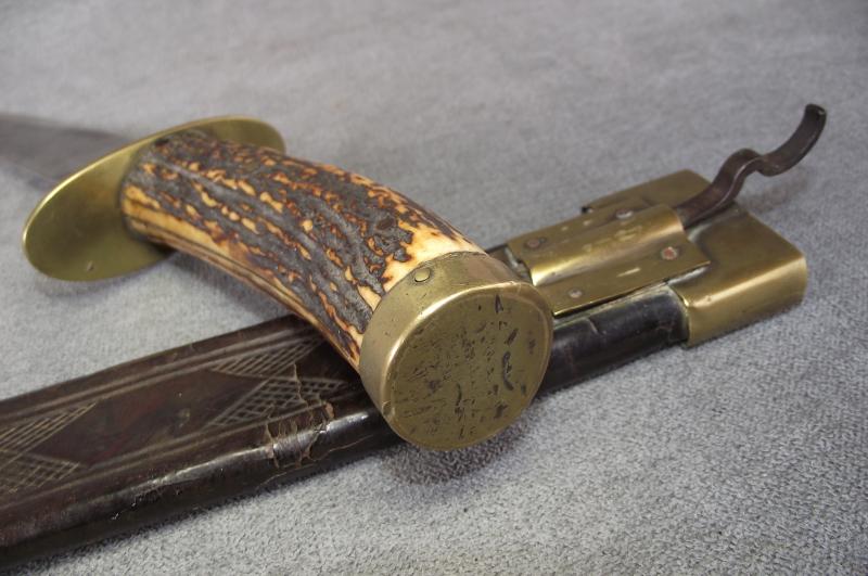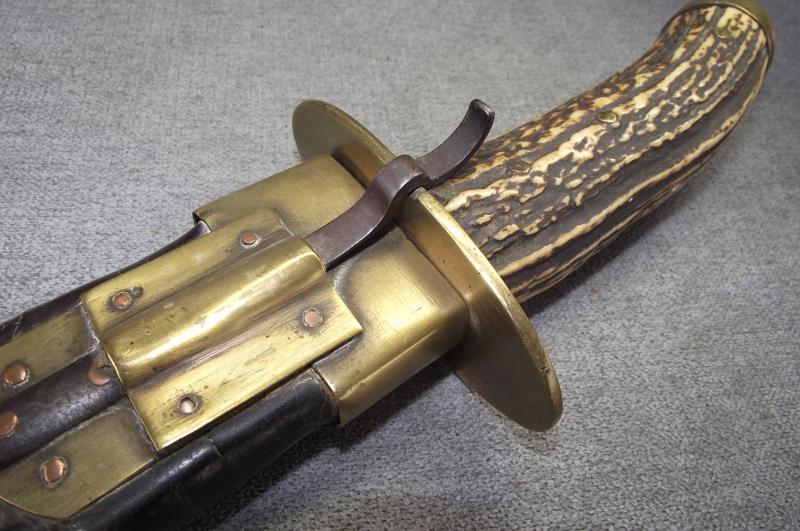The nearly 10 inch blade has minimal staining and light sharpening to the cutting edge. Brass hilt , cross guard with slight movement and the top pommel being slightly loose from age and storage. The horn handle is in perfect condition with a diameter of around nearly 5 inches. The patterned leather scabbard has tight stitching along its seam with the bottom area attached to the brass chape having worn , perhaps bent over time, its weak with some holes but not come adrift. Brass scabbard top has the usual type fixing found on these Victorian type hunting knives produced for British hunters and folks on an expedition. No makers stamps to be found. Total length from bottom of the scabbard to the top pommel is 16.5 inches.