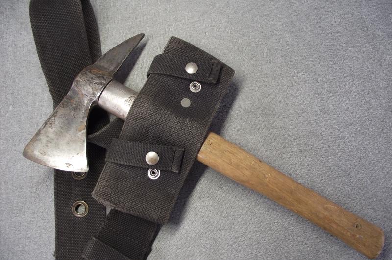 WW2 British George 6th Stamped Fire Fighters Axe and Webbed Axe Case with Belt.
