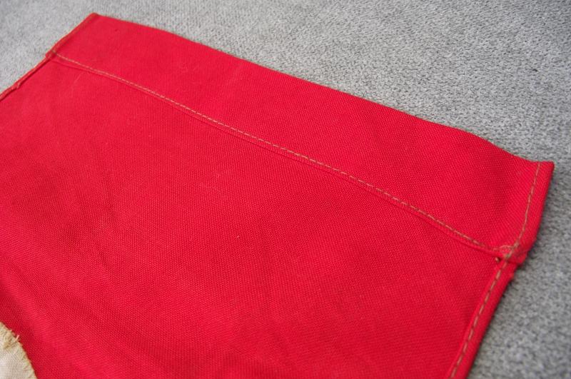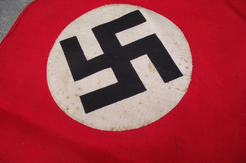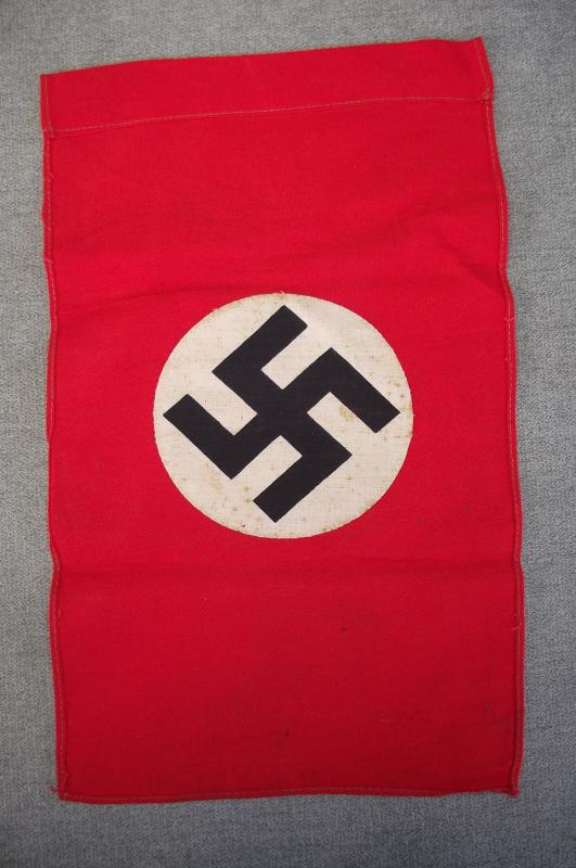 This is the small type seen flown from windows etc by the public during NSDAP events in there area. The condition is very good with a nice bright finish to the red cotton material on both sides including the machine sewn printed central white disks with swastika with some slight foxing.One end has a sleeve for either a small wooden pole or hanging string. Flag measures around 11.5 x 7 inches.