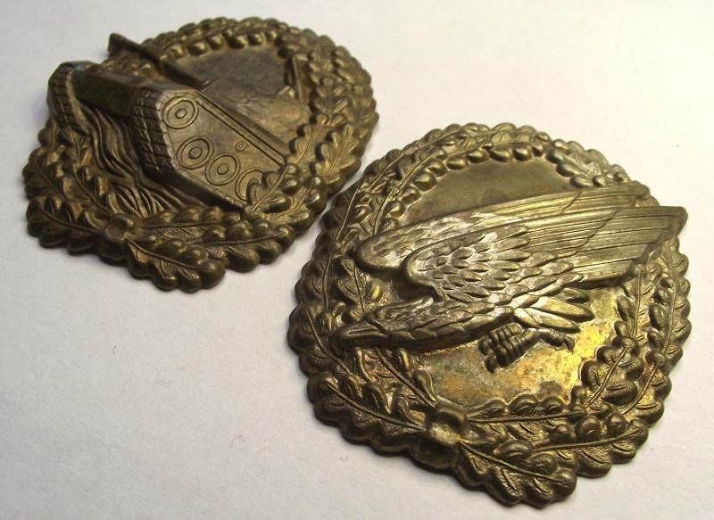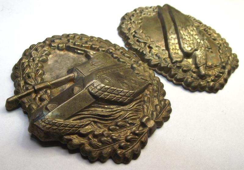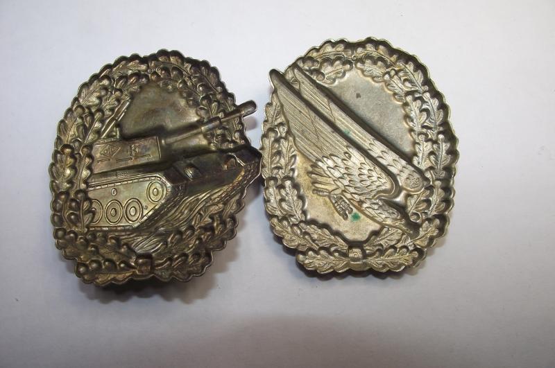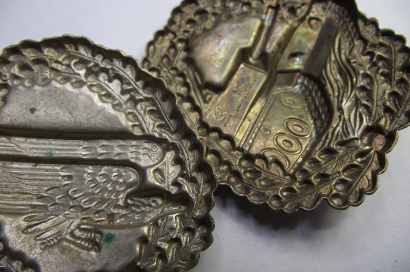 These two badges appear to be unfinished planchet without the cut outs around the central design or any fixing pins to the rear. Both are maker marked to the firm ''OLC''