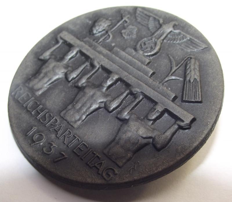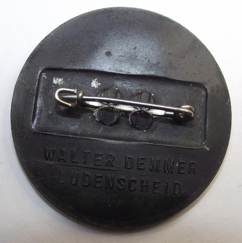 In nice condition with sharp detail but missing its finish and with a certain amount of verdigris. The rear has its period fixing pin and makers details.