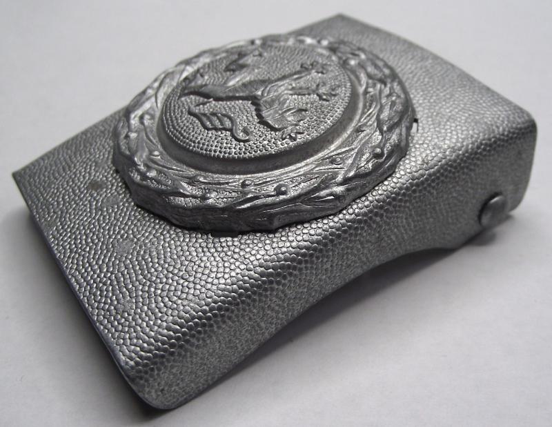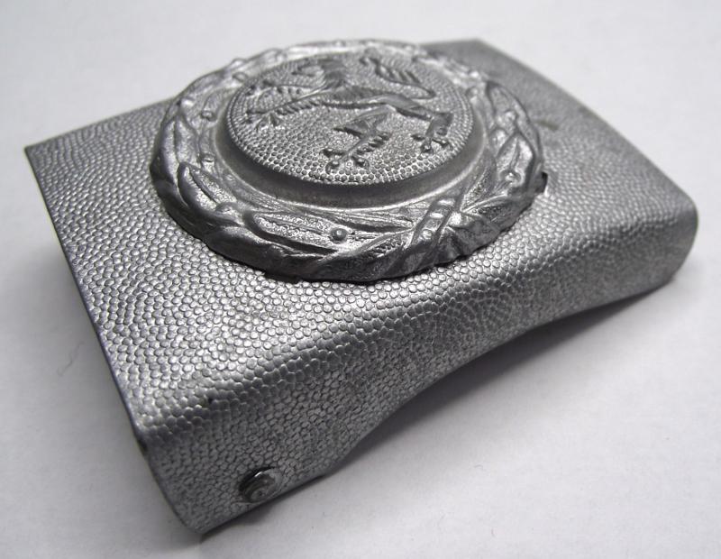 These buckles with corresponding state corresponding face plate where introduced in 1935. This example is in close to mint condition with very little wear to the pebbled body and raised central motif. The rear has its back bar and fixing prongs.