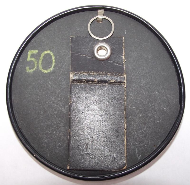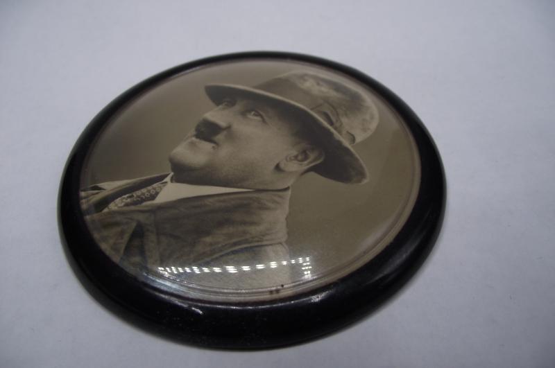 Measuring just over 3 inches in diameter this is an early example with Adolf wearing his favorite fur fedora cap. The back has a hanging loop and a cardboard type hinge.