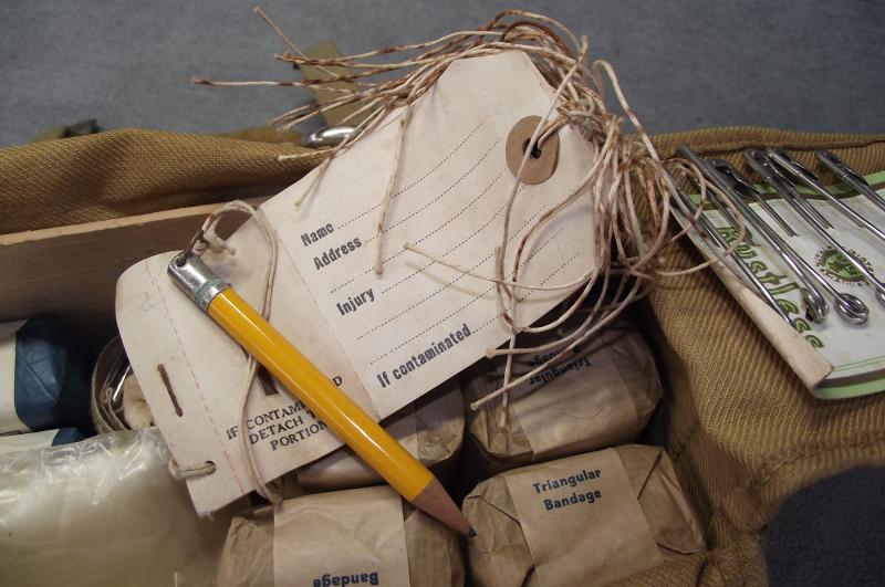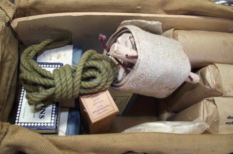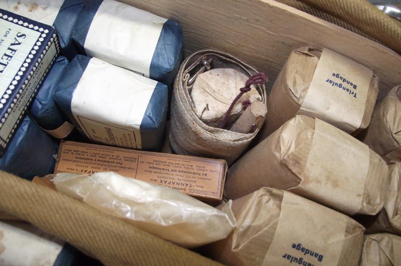 Straight out of a local house attic on Tuesday is this untouched, can i say, time capsule complete first aid pouch to a member of the Passive Air Defence section of the British military forces. As seen in the photos it would appear complete with bandages of various sizes, tourniquet, safety pins, burns jelly, scissors and a complete set of contamination labels for the injured and pencil. I have not cleaned anything as i would like it to go out as i found being the first person in over 75 years to remove items, i only took out three or four for inspection and you can be the second person in 75 years to do the same! A super untouched item and of course new to the market.
