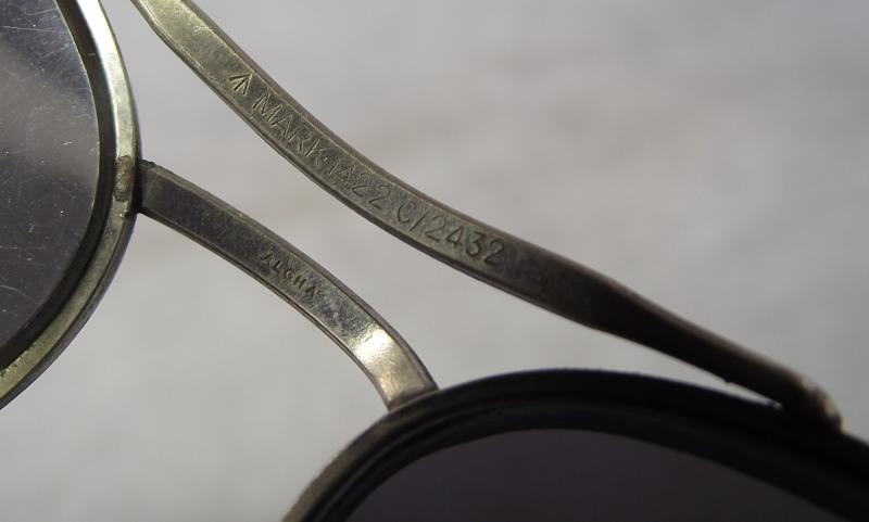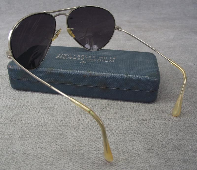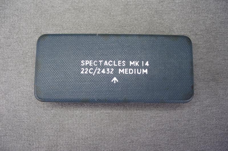 A good used set of MK14 spectacles as used by RAF aircrew. This set still found in its period carry case is in good used condition with surface scratches to the lenses, both arms are perfect and glasses carry the RAF sores code to the central arm.