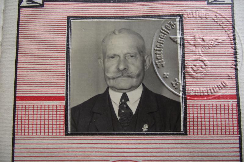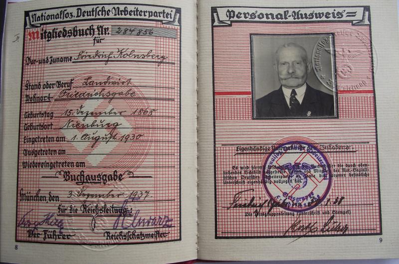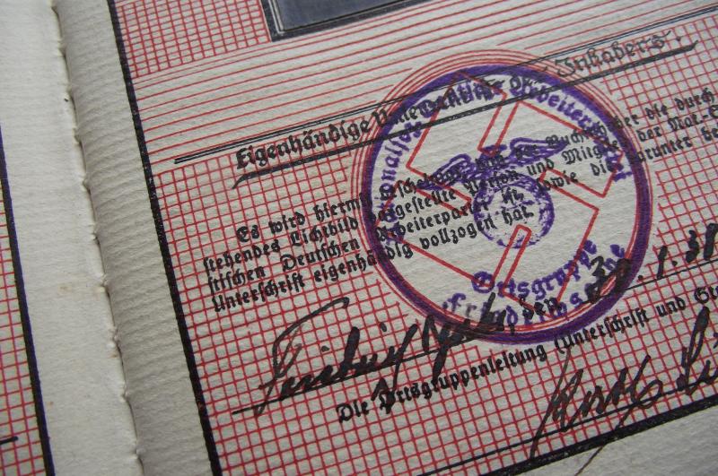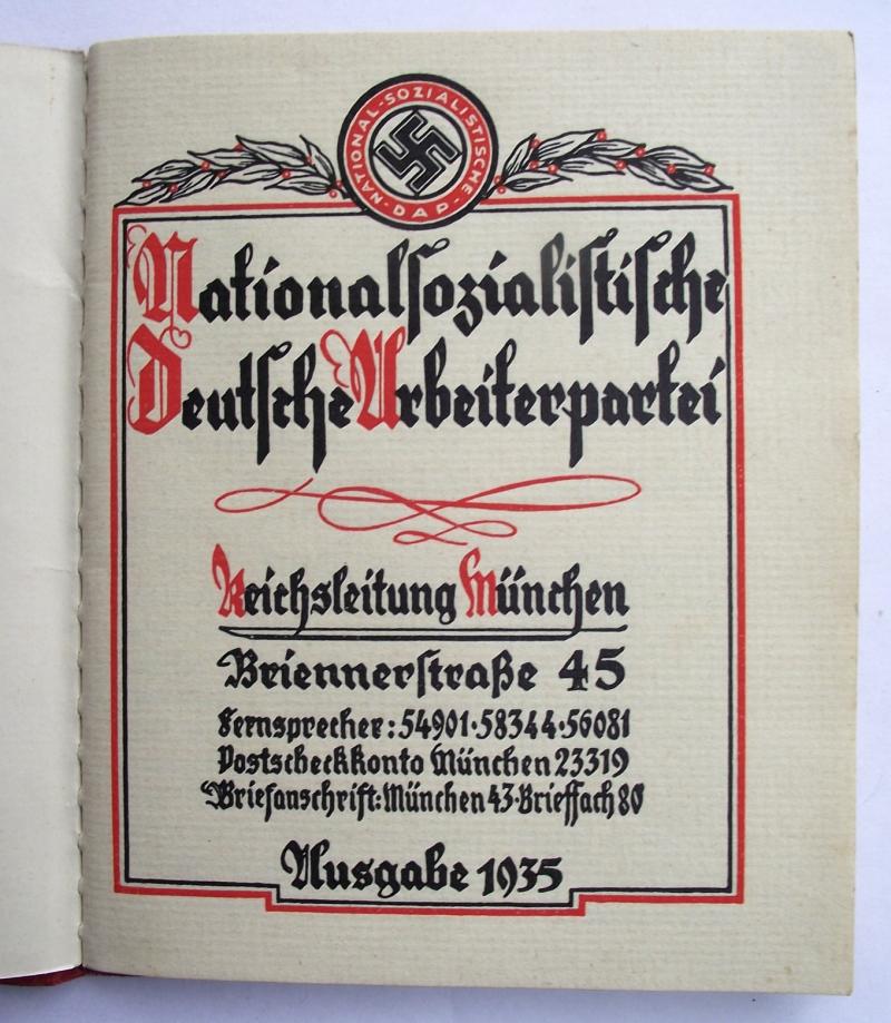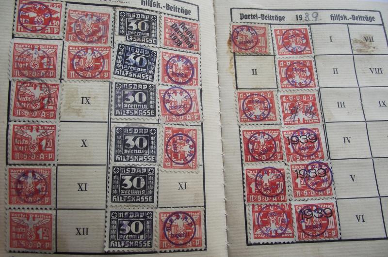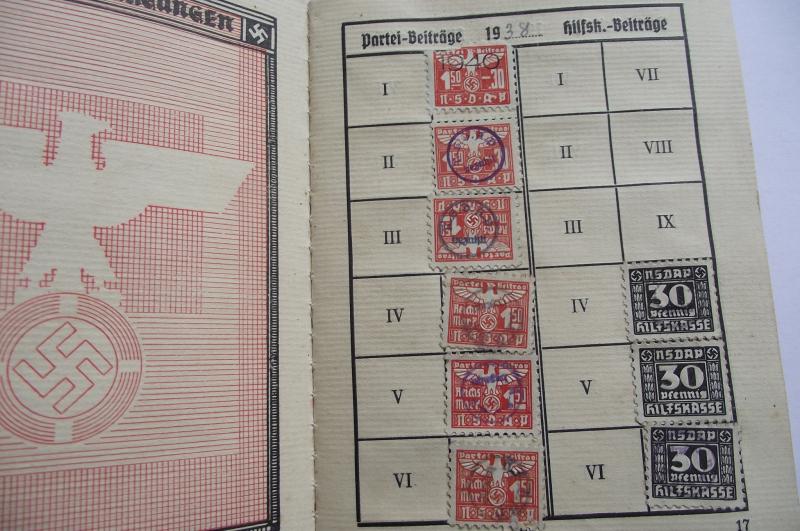 In very nice and complete condition example with his stamps paid from 1938 to 1945. It would appear this fella joined the party in 1930 and has what i believe is quite an early number. The book is a 1935 edition and might be a second issue with stamps starting from 1938. As seen in the photo he is wearing the party badge and sympathiser NSDAP eagle stick pin.