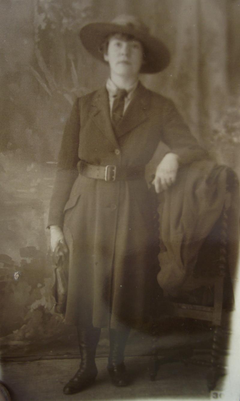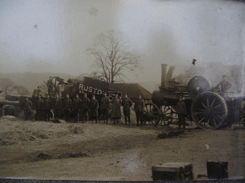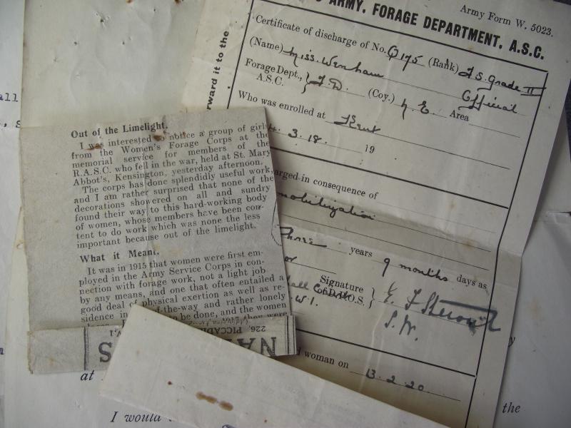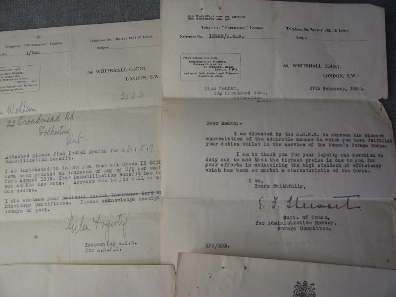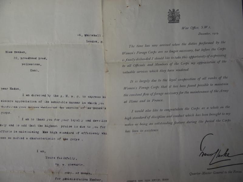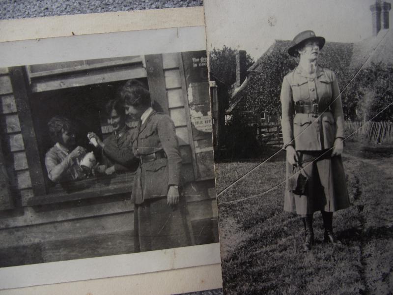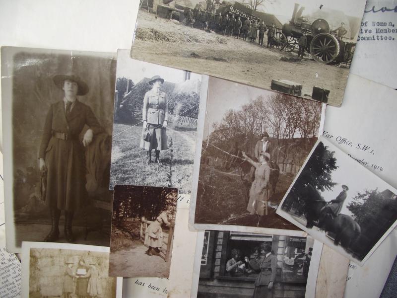 A very nice grouping of documents and photos of a lady who served in the Women's forage Corps in WW1. There are four official documents related to her service and her Certificate of discharge. With this comes some fascinating photos of Miss Wenham, if your into uniforms of the period, wearing her WAFC outfit , all annotated to the rear with details by her daughter. In my opinion the best is the larger photo showing a squad of soldiers bailing hay using a large WD marked steam tractor with Miss Wenham in the middle, obviously in charge of the group. To add to this interesting grouping is a full photo album containing photos of numerous war graves she visited in the early 1920's including a number of shots of King George and Queen Mary at one site. Also included are a few shots of the I.W.G.C. administration camp. The grave sites visited and photographed are....Terlincthun, Longuengesse, Cinq Rues, Brre, Poperinghe, Vlamertinghe, Dud corner , La Chaudiere, Arras Road, Ecoivres, Euston Road, Courcelles au Bois, Bertrancourt, Lovencourt, Acheus, Forceville, a number of more are listed. 45 pictures in total. A very interesting group not only from the WAFC angle but also from the point of the British War Cemeteries, when they where overhauled especially for the King and Queens visit. Miss Wenham moved in the 20's to Abergavenny and married a local officer from the RFC, dying in 1955.