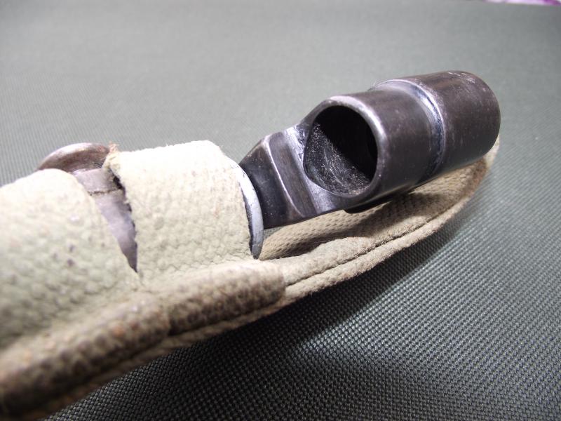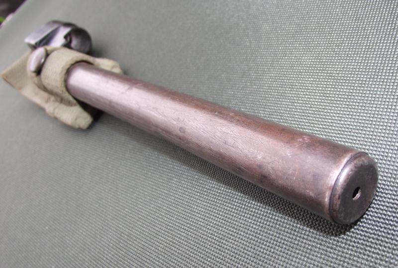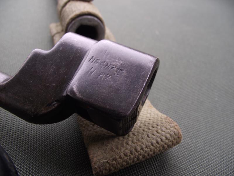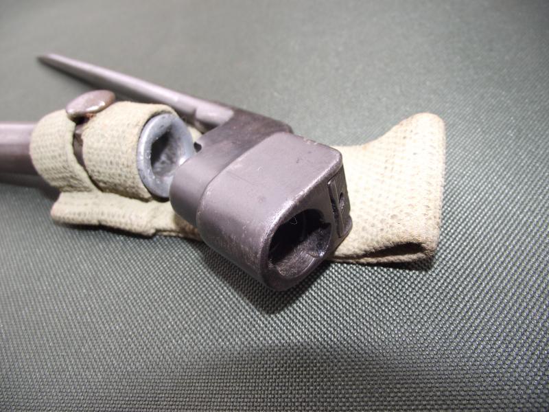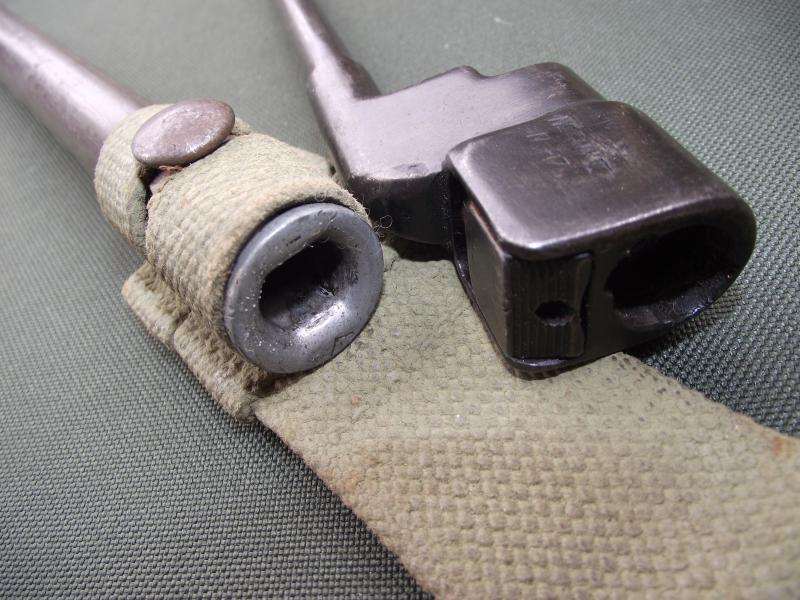 The bayonet has most of its period finish intact with a faint N67 stamp as used by the Singer factory after 1943. This example comes with a nice steel tube scabbard, good finish and some minor knocks, and a nice No4 produced frog.
