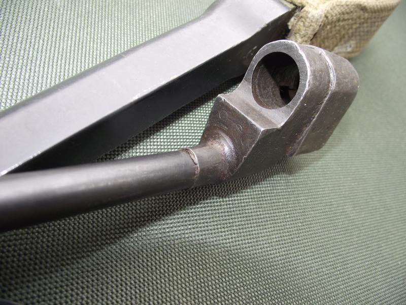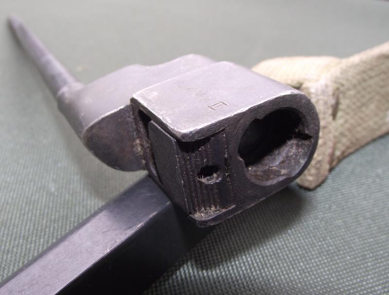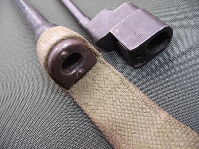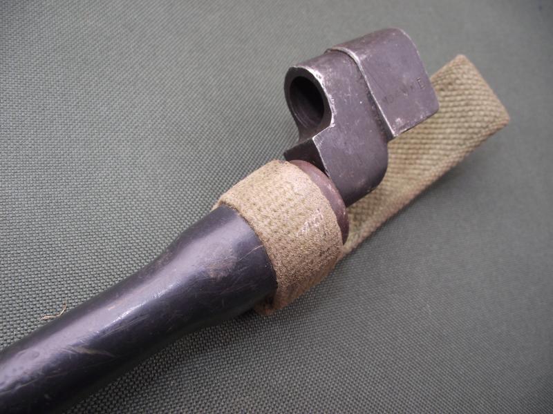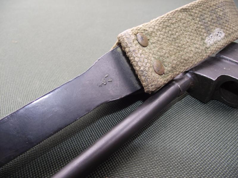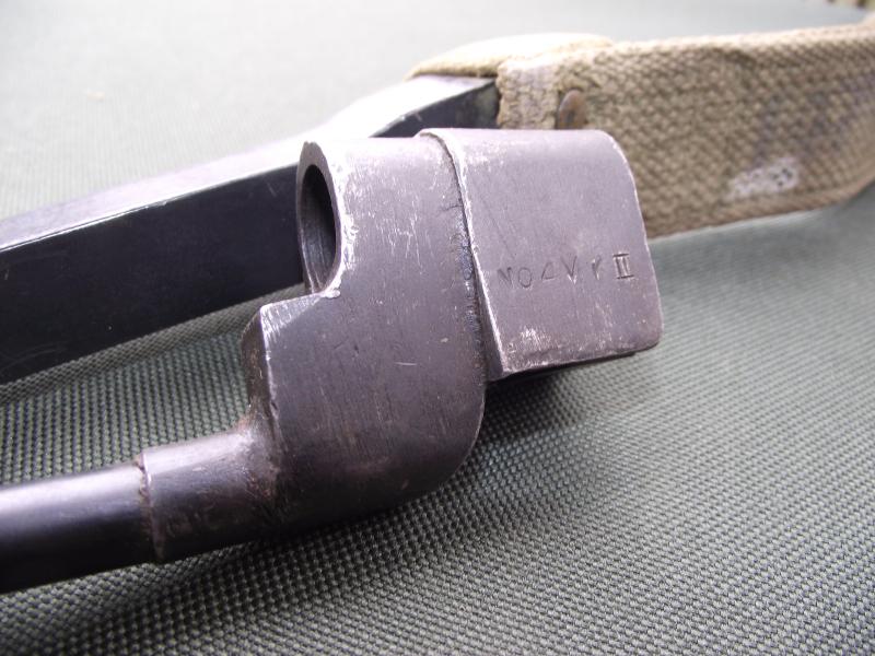 The bayonet has close to all its factory finish with a clear No4 MKII stamp to the side and a clear number 56 stamp to the socket face relating the the manufacture firm of Prince-Smith. This example comes with the ''Lend-Lease'' Victory scabbard thats in nice condition with a clear raised stamp to the back and its webbed frog.