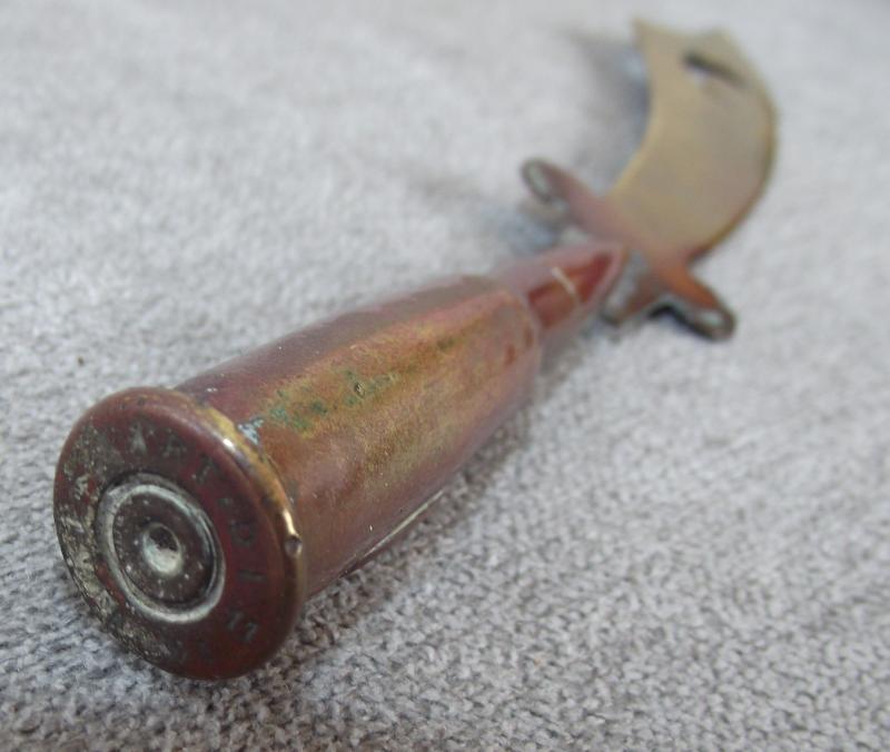One of the many types of souvenirs produced just after the end of WW1 for sale to the thousands of family members who visited the battlefields to see where there loved ones fell. This example is of interest with the use of a German button on the bullet.