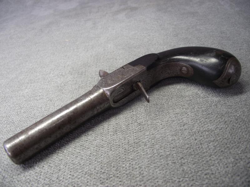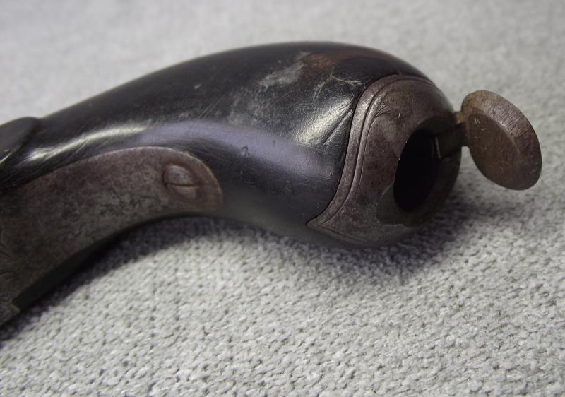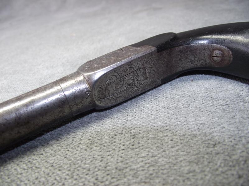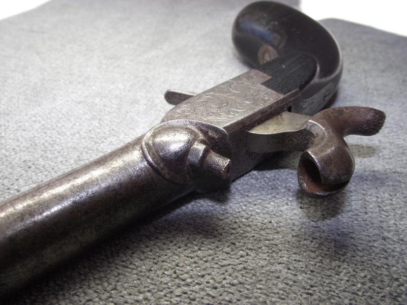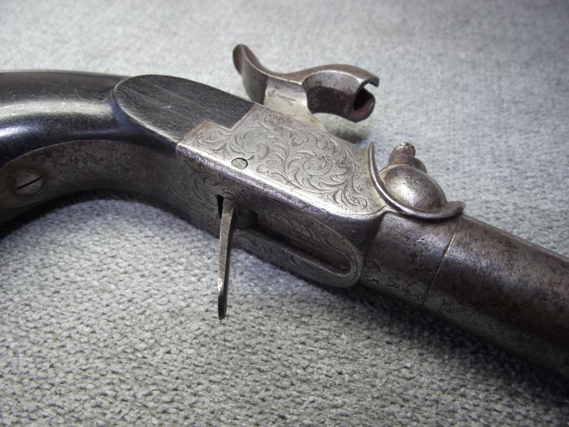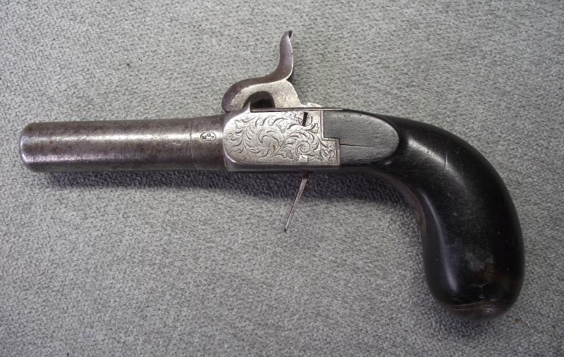 Pocket pistol with turn-off 2 inch barrel, not attempted to remove, stamped with a clear Liege proof marks including to the bottom of the barrel the numbers 6/53 and a concealed trigger. Pistol body frame with nice engraving to all sides. Overall the metal has a certain amount of staining and some minor pitting around the base of the percussion cap area. Cocks and fires perfectly. The wooden ''bag'' butt has taken on a very nice dark patina with the end metal being hinged to take extra caps.