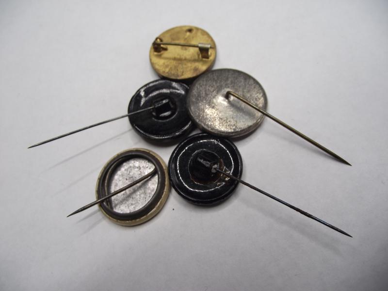 Nice set of five badges that are in good condition with there fixing pins. Of note one stick pin fixing loose on one of the black badges, held in with blue tack.