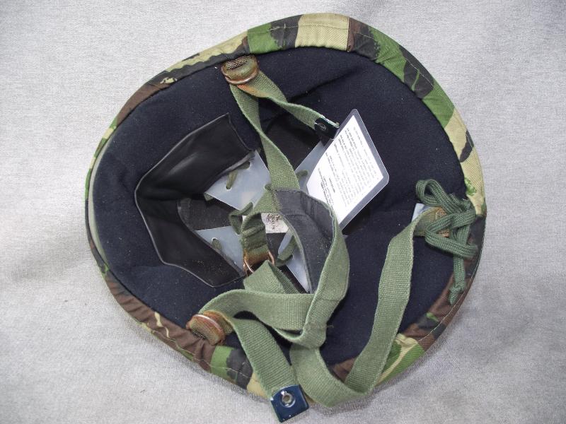 In very nice condition with its camo cover. I have not taken the cover off but all indications suggest a full undamaged rough finish intact. The inside liner and chinstrap are complete with a clear inside label and still having its instruction label attached. Size states medium. Some slight rust bleed to the chinstrap metal loops.