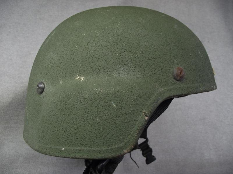 A well used ballistic helmet with all of its rough green finish intact to the outside shell. Three holes to the front where the NVM once was. The inside has its complete liner and chinstrap system with both side labels intact with helmet designation. No makers details but might well be Gentex. No size but compared to others i have id say medium.