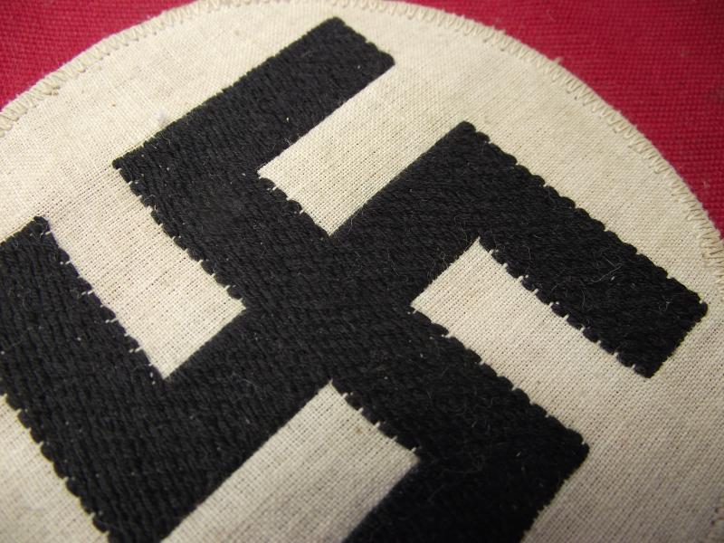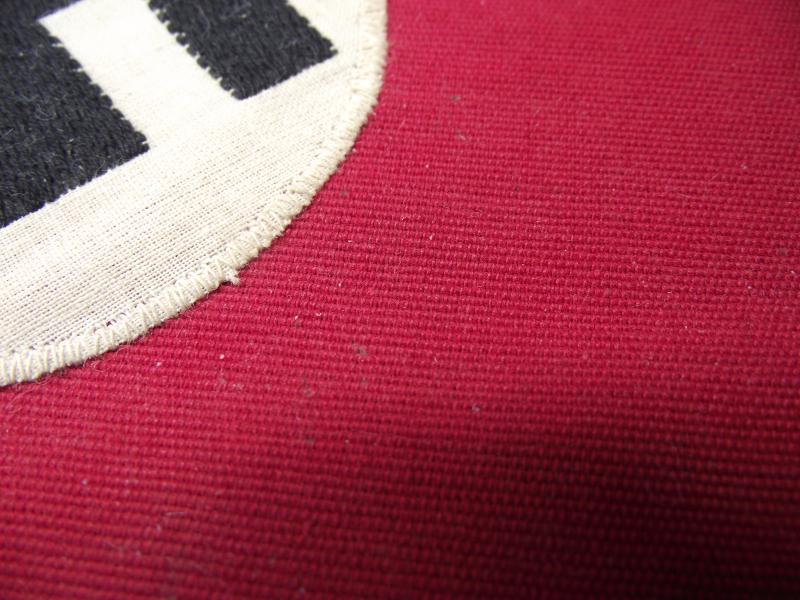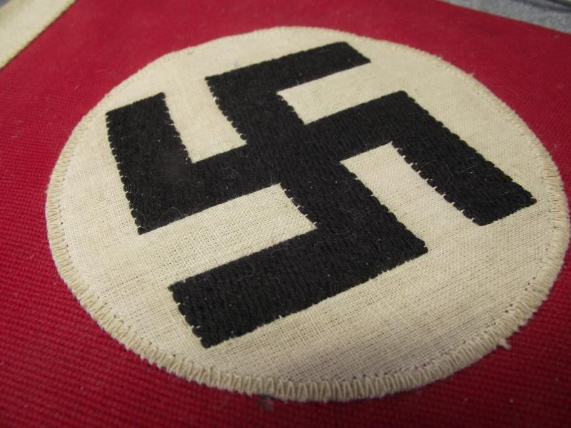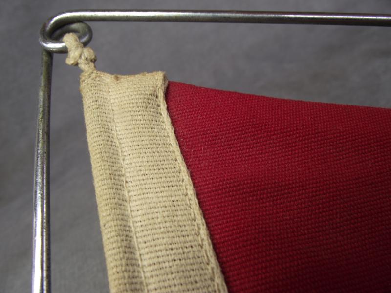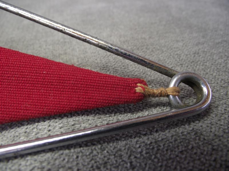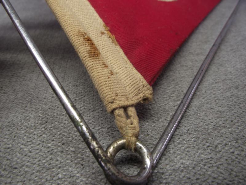 The double sided pennant is in very nice condition and measures 8 inches in height and 13 inches in length. The swastika roundel is the bevo woven example, both sides. The red material is slightly heavier weave than usually found on such sized pennants and consists of two sections sewn together. With the type of material used and framed in a tube steel frame it can be suggested this is either for a vehicle or perhaps a small boat. Well thats my guess folks. Still its a very nice and displayable example.