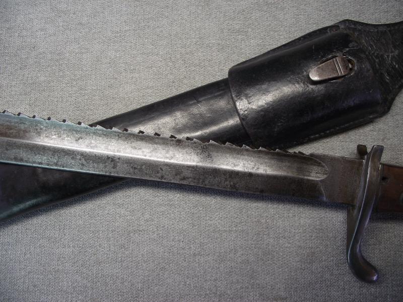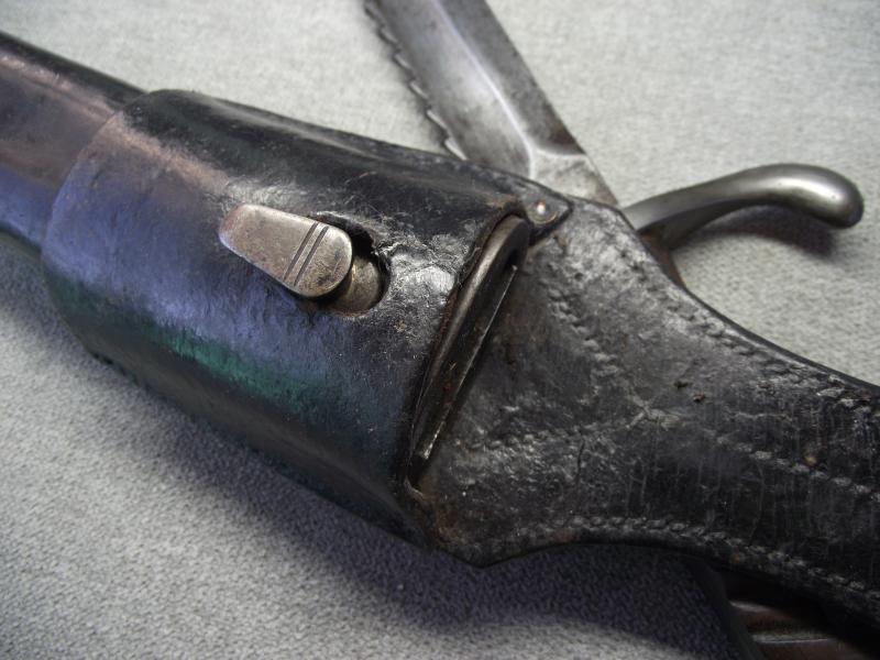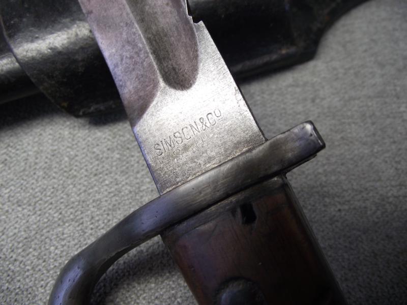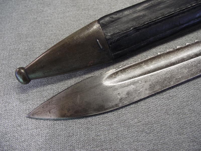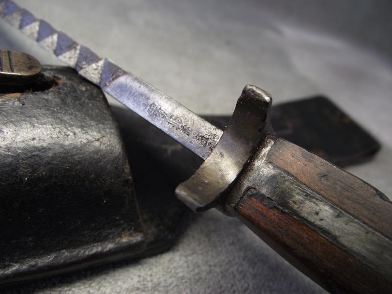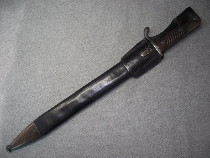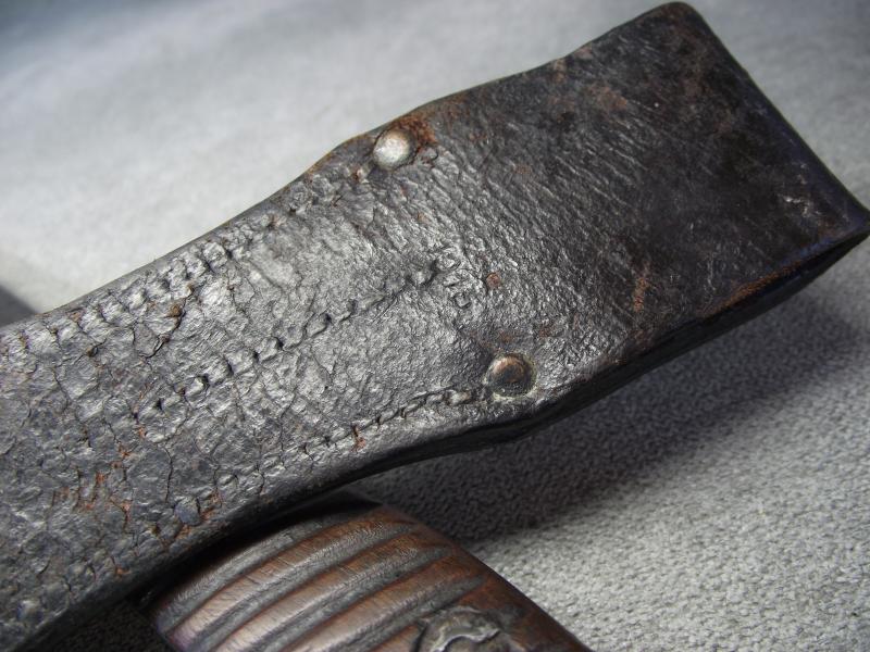 A nice scarce early ''high ears'' example with the Simson & Co marked blade having some dark staining, factory edge and sharp profile to the top teeth, spine has a 1915 date. The metal hilt again with an overall dark finish, one waffenampt stamp and a working top button. Both wooden grips are chip and crack free. Leather scabbard has hardened but all stitching is tight and complete. Both end metal fittings dark with plenty of patina. The faint 1915 dated leather frog is supple with one area of damage where the leather has split, this is repaired the old way coated in what might be boot polish. A very nice e and scarce example for sure.