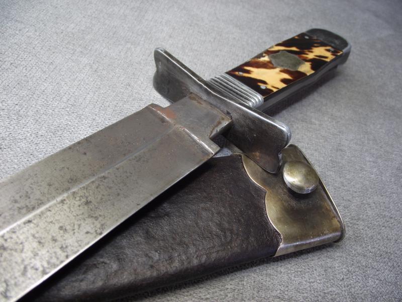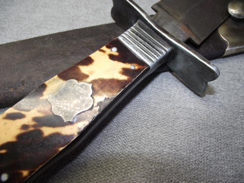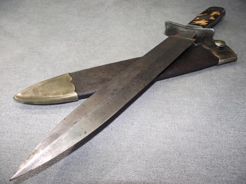 This is a gorgeous massive Victorian example thats in very nice condition considering its age folks. The just over 11.5 inch blade has some minor staining with its factory buffed grain still visible. Cutting edges have not been sharpened, just a couple of tiny knocks from storage, blade has its period tip. Blade has no makers stamps or other details. Blade width is one and three quarter inches. The hilt and shield to the center of the handle appears to be some sort of white metal perhaps what they call German silver but im not 100% sure. The tortoise shell grip plates are in very nice condition with no chips or cracks just one slight wear patter from use to one side. Handle measures just over 5 inches and the cross guard is 3.5 inches long. Its period leather scabbard has the same white metal mounts as the dagger with a few minor knocks to the bottom chape and of course dark staining from its age. The leather has some suppleness but rather hard with one hole to one side under the bottom mount, the stitching is complete. Its a pity that this Bowie is unmarked and would make a perfect item to collect and display.