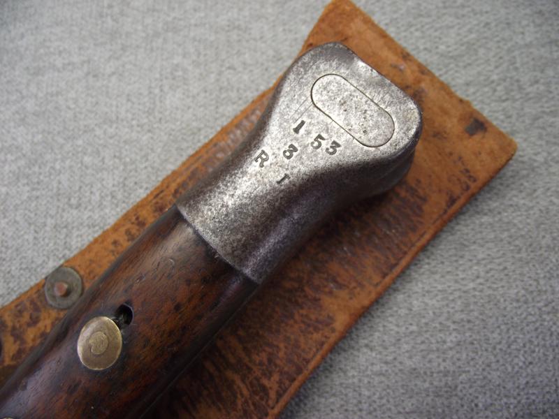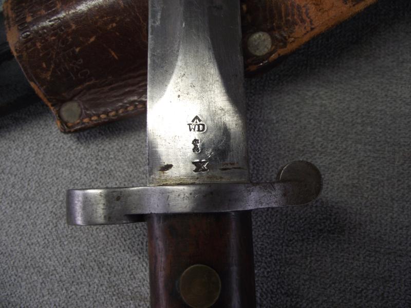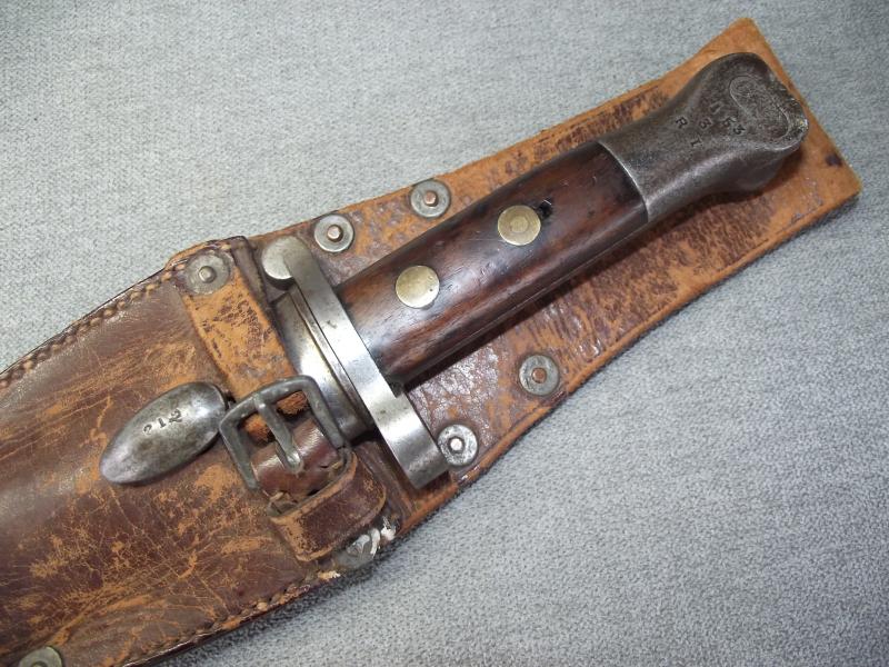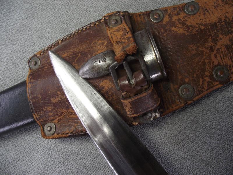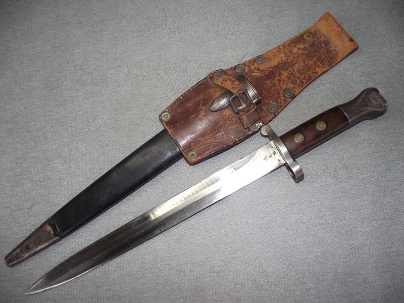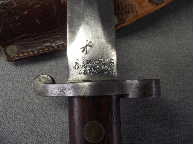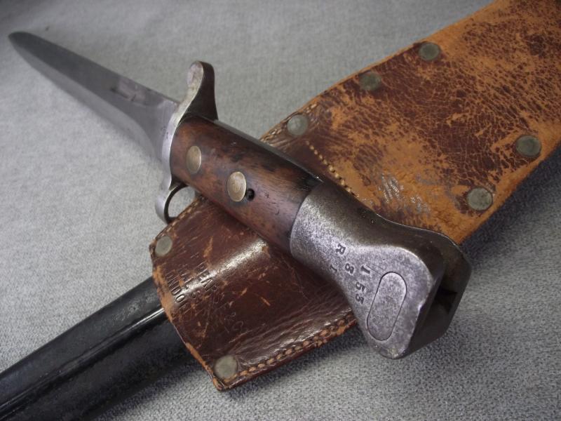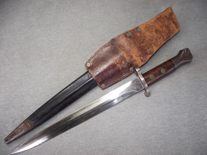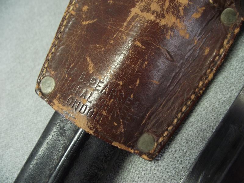 A ''sleepy'' example that has always been together in my opinion. The ''Mole'' marked blade has its factory cutting edge without other sharpening and has minimal staining with slight knocks to the edges, hard to see. Under the ''Mole'' mark is the manufacture date of 7/91 with various other stamps and a very clear ''out of service'' stamp above. The other side has a clear WD stamp etc. Cross guard has minimal staining leaving the pommel with a certain amount of patina with working top button. The pommel on one side is stamped i believe to the 3rd Battalion of the Royal Irish. Both wooden grips are in fine chip and crack free condition. Black leather scabbard is supple with tight back stitching, metal mounts have taken on a dark patina. This bayonet is found in its period brown leather and maker marked frog that is again in supple condition with a certain amount of wear to the top finish and sorry to say missing its closing strap tip. Its top fixing button has a number stamp. Back has a clear makers stamp for the firm J&B.Pearse of London.
