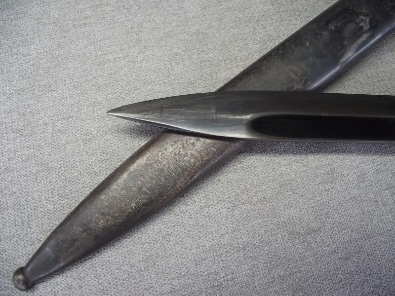 The blade has close to all its period factory finish intact with a minor sharpening to the cutting edge, hardly noticeable in the photos. One side is stamped to the firm Elite Diamant with the other having a clear number stamp 5171, both these correspond to matching stamps on the scabbard including the date 40 found on the spine of the blade. Both grips are in nice condition with slight rubbing as seen also on the cross guard. Pommel has clear waffen ampt stamps seen under the slight surface bleed, i have not tried to clean this area up, top fixing button works fine. The steel scabbard has a good amount of period finish mixed with some scuffs and wear and just the slightest of fiel markings to one side near the bottom button, this button has a clear Waffen Ampt stamp.