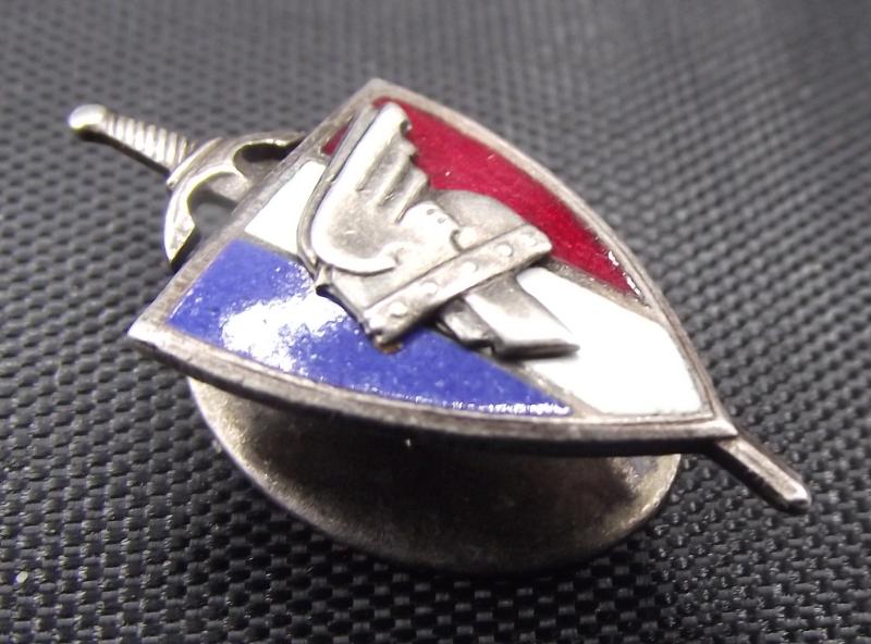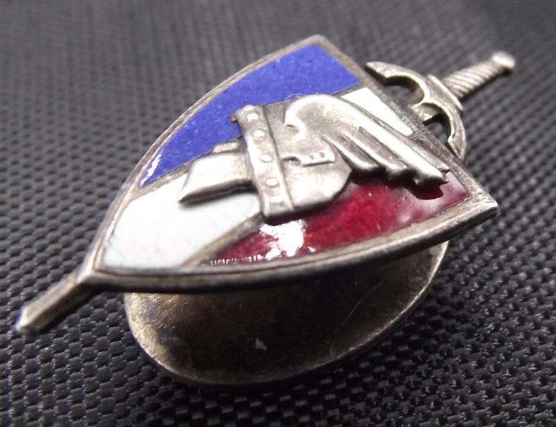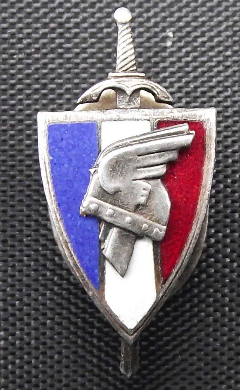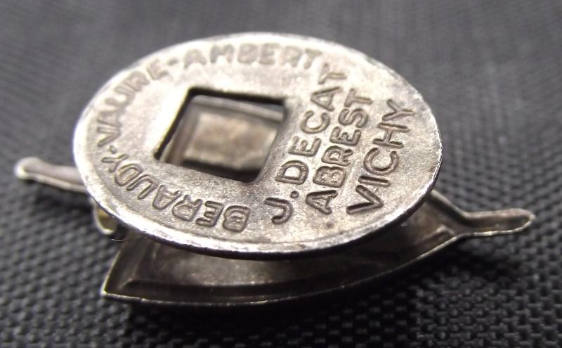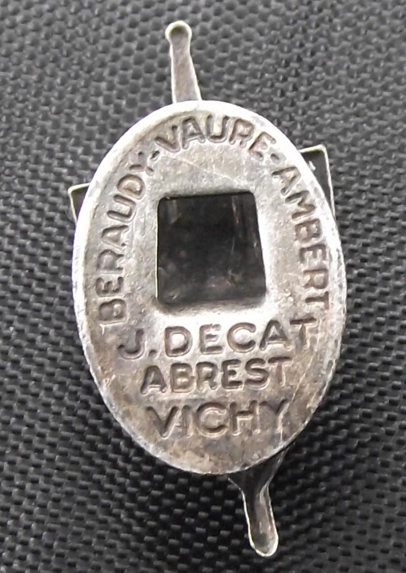 Nice designed badge with nice enamel and silver finish. The back is stamped to a Vichy maker with full details.