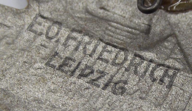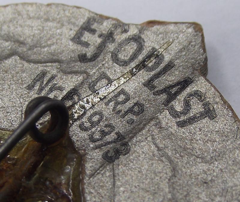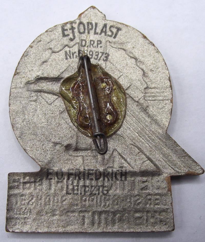 An interesting Large badge made from compressed card with sharp detail and a very nice finish, lets say 100% complete. The back has the makers details including the manufacture process. The pin is period but as seen its been replaced.