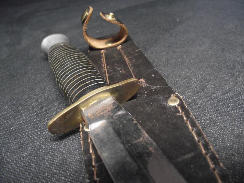 The Venture stamped blade has nearly all its finish with just a couple of minor areas of bleed coming through, still has its factory tip. Brass cross guard is fine but with the slightest of an upward kink to one end, top aluminium pommel is fine. The plastic and copper washer handle is in fine condition with no cracks or knocks. Comes with a very nice ''England'' stamped leather scabbard with tight stitching and a nice working top strap and popper.