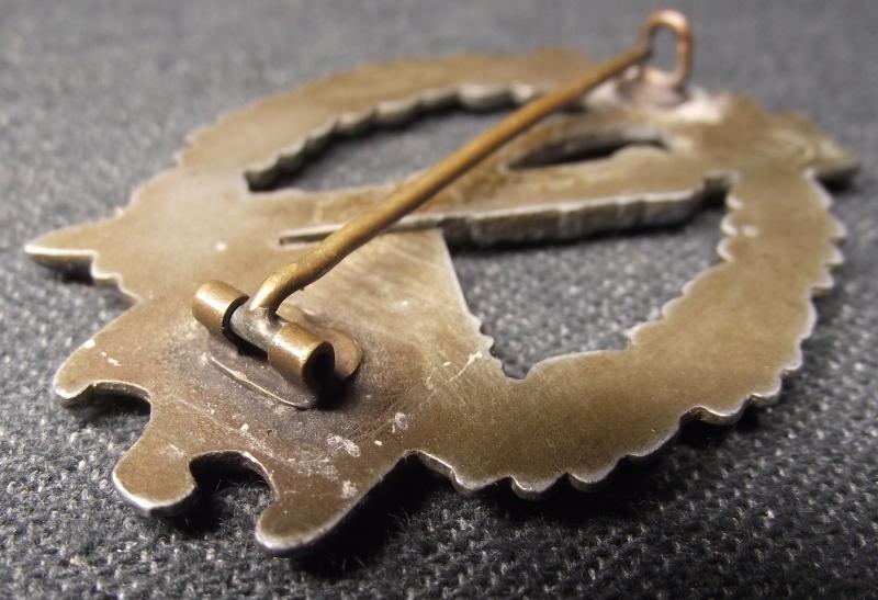 Zinc manufacture badge with over 40% of its bronze finish remaining. The rear has nearly all its finish and a clear Wiedman marking stamp. The bottom catch is a re-attached replacement as this badge with Lilly-pad hinge should have a flat wire example. I find it interesting that the type of replaced catch used can be found on earlier manufactured IAB's produced by Wiedmann.
