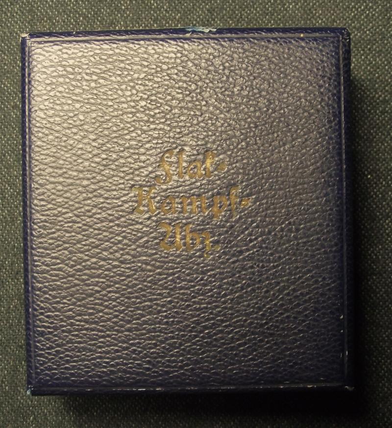 The early production badge is in very nice condition with nice dark finish and bright highlights. The rear ball hinge hardwear set up is usually attributed to Gablonze style and is complete without repairs. This badge comes with its period blue box that again is in very nice condition with clear details to the lid, faded slightly due to storage. Box outer finish is close to 100% clean with working front catch and back hing. Inside again clean with a complete cloth inner hinge. A nice early medal for sure!