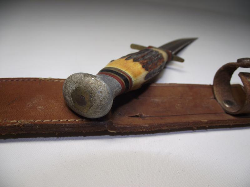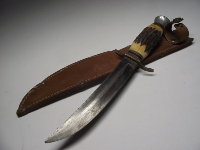 A nice vintage knife with a stained 5 inch blade without any makers details. The stag one piece grip has some minor cracking from age, all stacking rings are tight. Come with an ''England'' stamped supple scabbard.