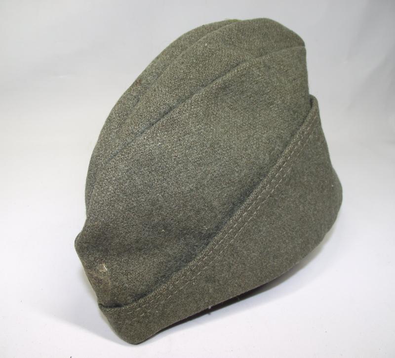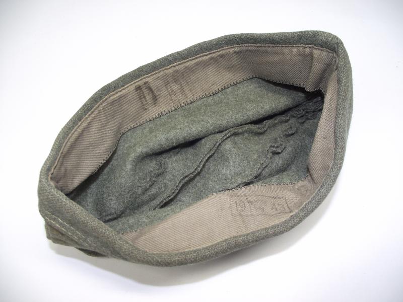 In nice used condition with some residue to the front peak area where a cockade might have been. The inside has its cloth sweat band, one side having ink stamps including three crowns and a 1943 date.