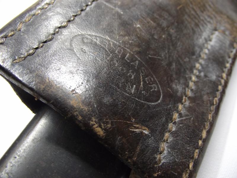 This would appear to be an untouched example still held in its leather frog. The blade has a dark finish from patina with an un-sharpened cutting edge, full tip and a clear makers stamp. The cross guard and pommel has the same dark finish with a working fixing button and stamped numbers to the guard. Both wooden grips plates are clean and without chips or bruising. The metal scabbard has all its finish with just a couple of minor knocks that are hard to make out other than when ''in hand''. Scabbard is held in its period leather frog thats complete , supple and maker stamped with a 1888 date stamp.