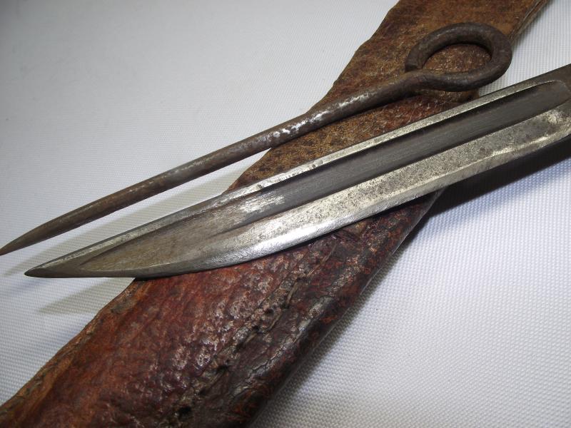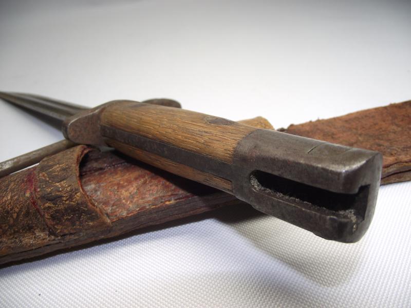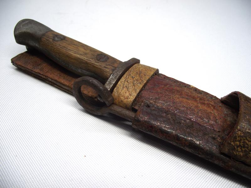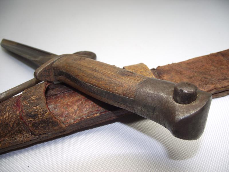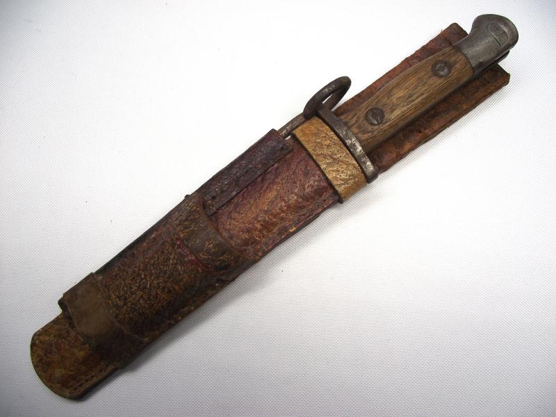 The bayonet was a WW1 Remington 1917 bayonet with the blade professionally ground into a sharp tipped fighting blade. The top rifle fixing ring has again been ground off and interestingly the grips have been replaced by two nice 1907 pattern bayonet grips. Additionally found in the scabbard is a converted pistol cleaning rod with ground down pointed tip, presumably another fighting tool. The scabbard is made from different pieces of the same pebbled leather, sewn and glued with one additional pouch to the front top, now empty.