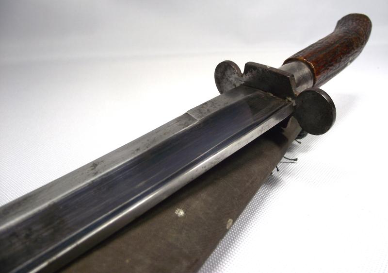 A very nice Indian made Bowie knife with a just under 12 inch blade. The blade seems to have started its life blued losing most on the high spots, nice fuller running along the top. The cutting edge and tip has seen some period sharpening as expected from a used item, no makers stamps. The hilt has a good amount of finish remaining with the stag horn handle in very nice undamaged condition. The knife has a very nice balance and light in the hand. The cloth covered wooden scabbard is complete with its bottom decorated chape and as seen in the photos when first produced had a dark green finish to the material, now gone from use.