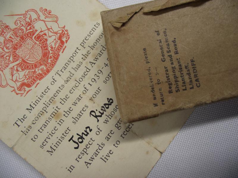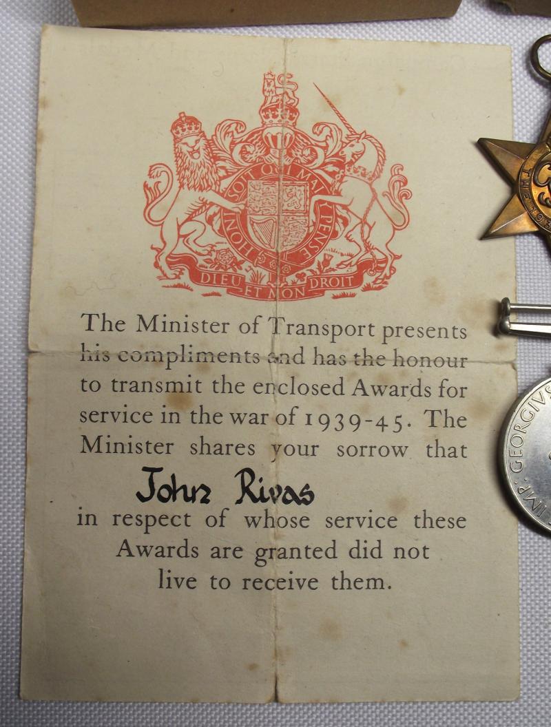 I purchase this group yesterday, after the family sold it to a local dealer, relating to a Cardiff man, Juan Rivas, who died during the sinking of the SS Empire Lake by U-181 in 1943, 250 miles east of Madagascar. Rivas was the ships Steward. As you see the group is complete with one anomaly using the British name John instead of Juan. There are only two Rivas on the CWGC website, one who was killed during WW1 and of course Juan. The medal slip is for merchant navy casualties and the back of the box also has details that relate to service by Merchant navy personnel. Rivas is an interesting surname being of Spanish origin and found all over South America and the Caribbean so research would be of interest im sure.
