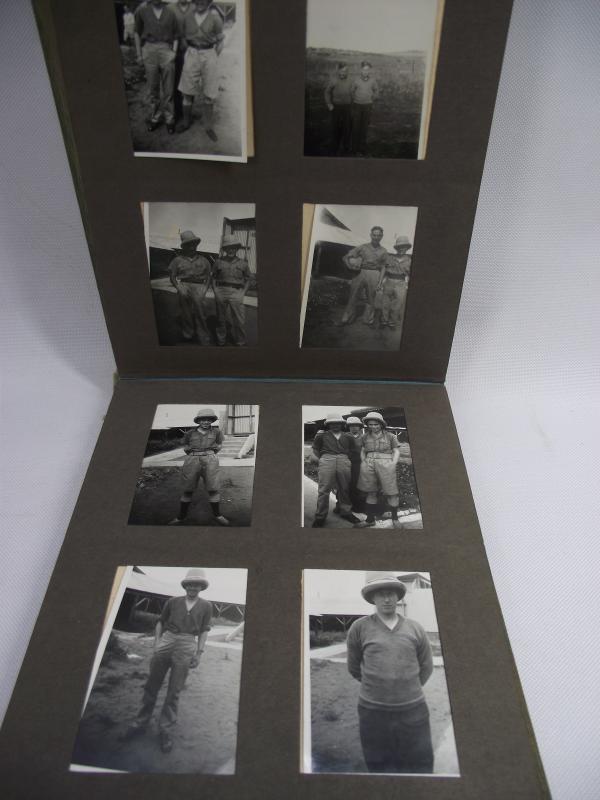 A very nice hardback photo album that once belonged to a member of the i believe is the RASC. There are 96 various photos in the album and 6 loose. The photos are quite detailed, nice uniform and vehicle details and a couple with blown up truck and locomotive with only a few photos of the native population and buildings. Im presuming this album dates from 45 till 48.