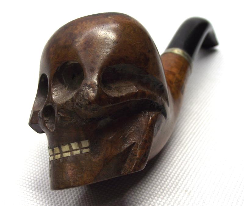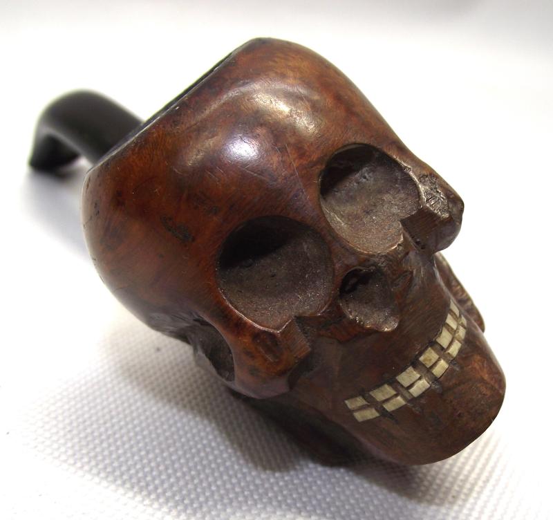 A very nice tobacco pipe with the bowl in the shape of a grinning skull. Its been well used for sure with lots of darkening to the inside and top of the bowl itself. Perfect display item that's for sure. Please check the photos for further details.