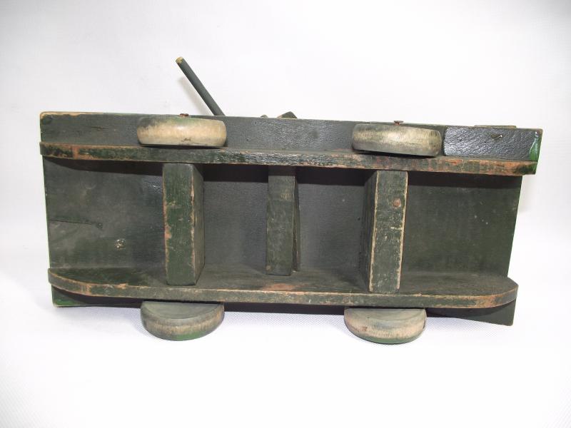 A very nice toy tank with very nice period paint remaining, some wear and scuffs from plenty of use , please check the paint loss to the wooden wheels. Turret swivels on a wooden peg. Toy measures 12 inches in length by a width of 5 inches.