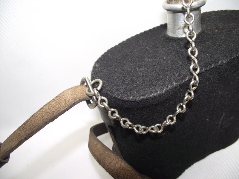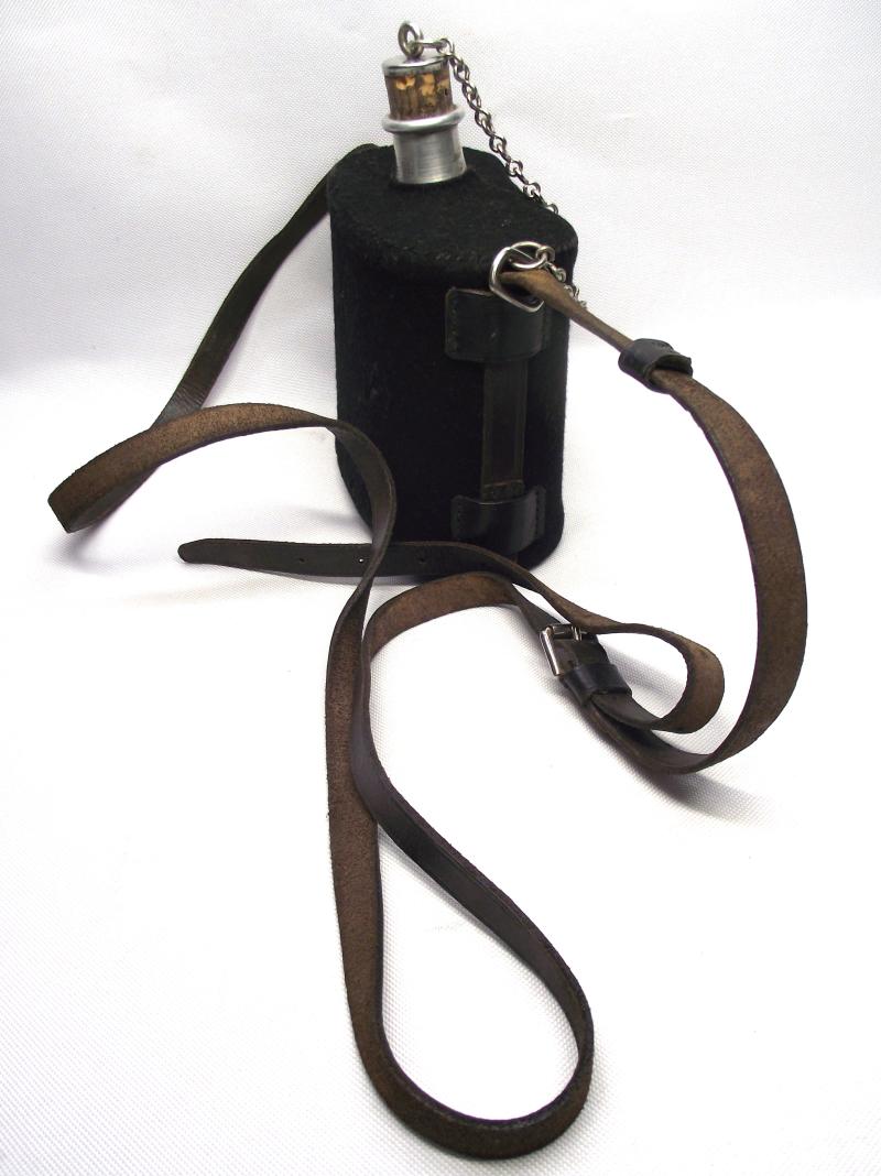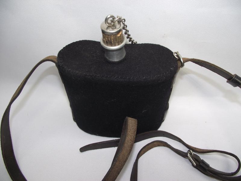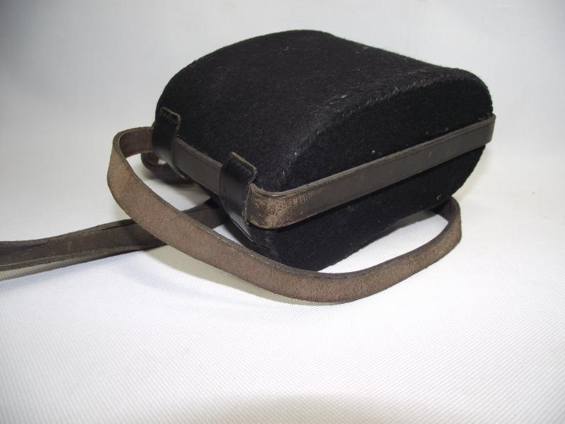 Ok so let me be honest, the title above is an opinion i have only, as i cannot find an example anywhere. It does have a feel of a WW1 period example with black felt body and the leather hanging harness, no stamps etc to be found. As for condition i would say its very good with some minor moth tracking only to the cloth cover , no dents to the body. Leather harness is supple and complete with all four leather fixing straps to the cloth in sturdy condition. The actual size of the body without taking the spout into consideration is around 5 x 6 x 3. So even without me being able to put my finger on use, other than carrying water, im inclinded to suggest its an interesting piece!