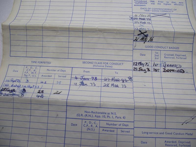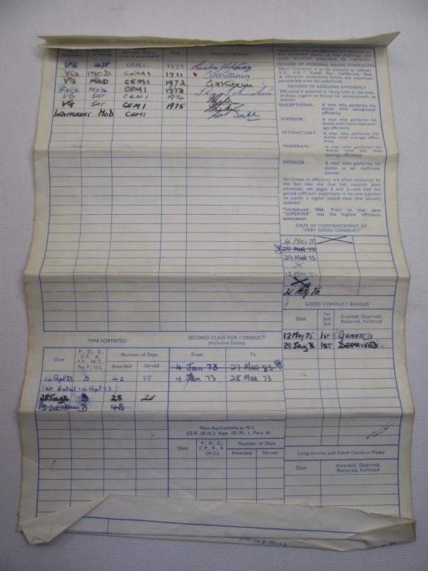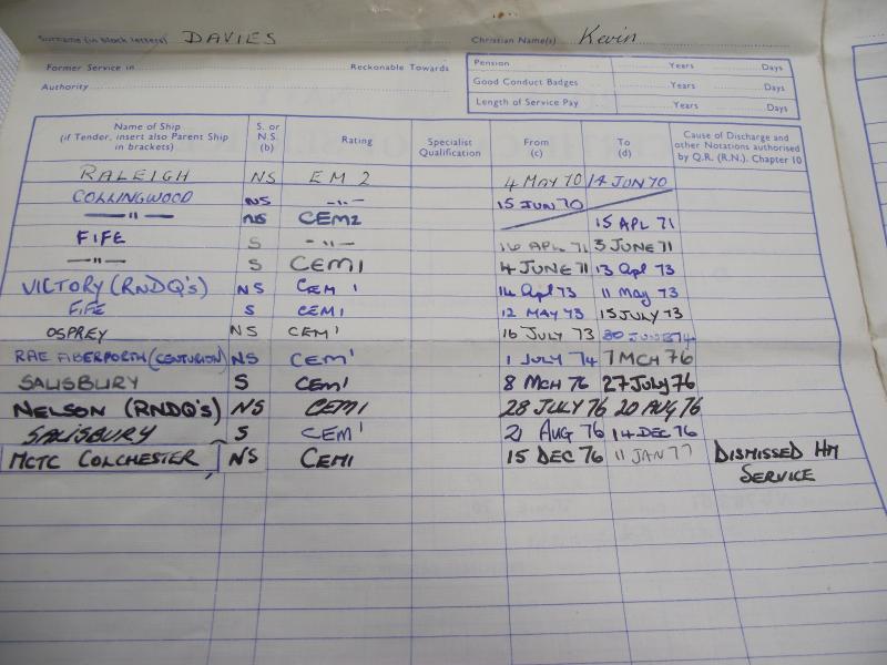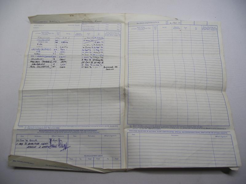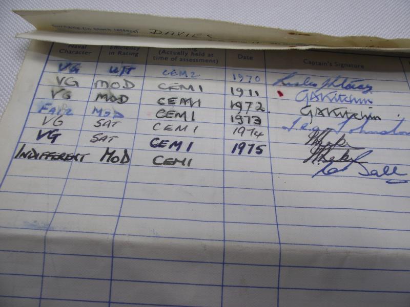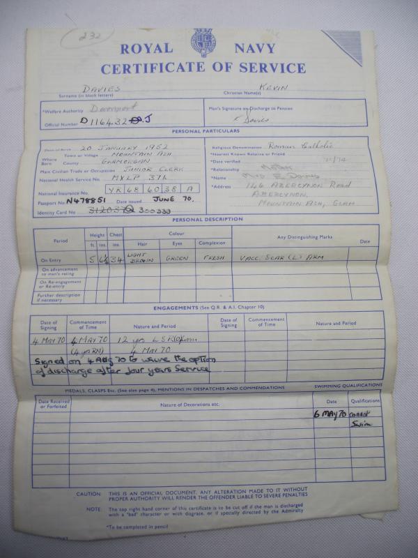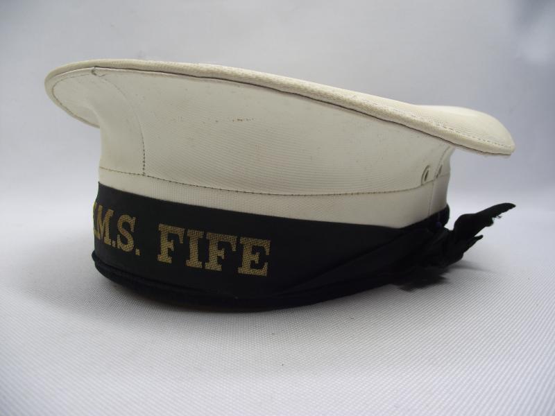 Purchased off a local family of the person who served in the Royal Navy in the 70's . Included is the veterans white top flat cap with HMS FIFE tally, he served on the ship from 1971 till 1973, large photo and Service certificate. Davies is the first on the left top in the group photo. According to his certificate Davies came from Mountain Ash in South Wales and joined the navy in May 1970, serving seven years. His service appears to have been very good until around 1976 where his Character is described as very good down to Indifferent, loosing a good conduct badge and being ''dismissed from Service'' in 1976. Family did mention he left under a cloud but no further info given. Cap is in very nice condition with name inside.