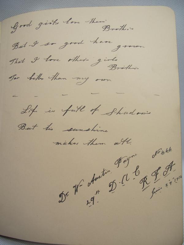 In very nice condition with some very nice drawings found inside and some written sentiments, all are dated from WW1. I may add that this book has lots of empty , unused pages with just a few more than i have photographed as this would not appear to be the usual ''nurses'' example that are usually found completely full with the sentiments of wounded troops in Hospital.