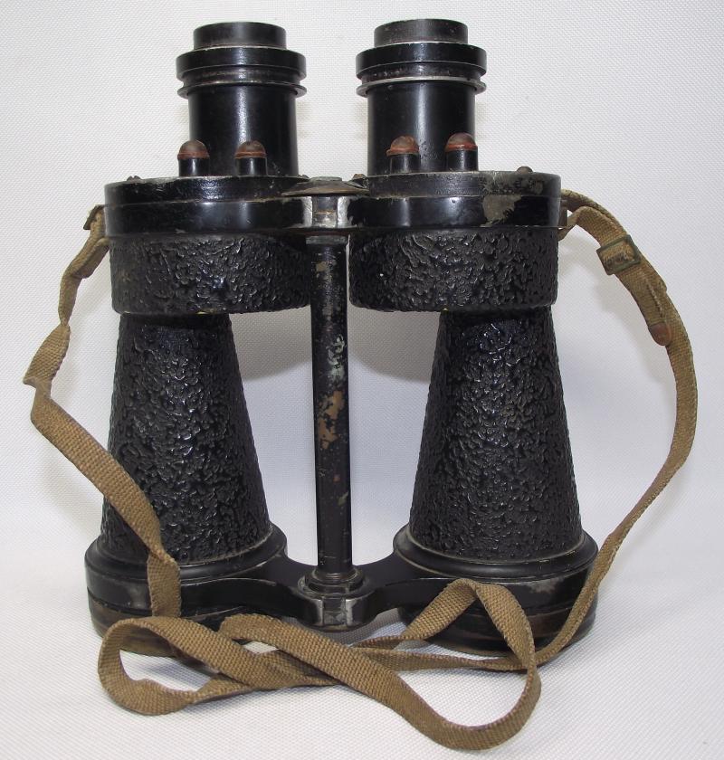 In very nice condition with close to 100% of its crinkle finish to the outer body and minor paint lose to the brass outers. The end plates have clear detail stamps and some red paint to the four large screws. The optics appear clear and sharp without clouding or chips to the inner prisms. The web hanging strap is broken and not complete. All you need to finish is the rubber eye shields.