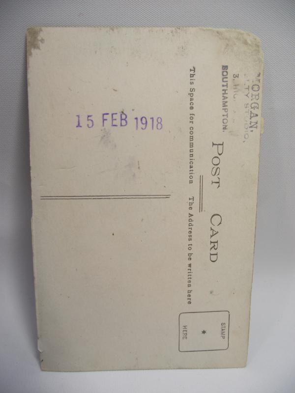 Well this is a really sweet studio photo of a young lad in the Cameron Highlanders proudly wearing his ''Tam O Shanter'' Cap and uniform. The back hasd a clear 1918 date stamp. Condition is good with one corner damaged. One would hope that being such a late date this ''young un'' survived the war.