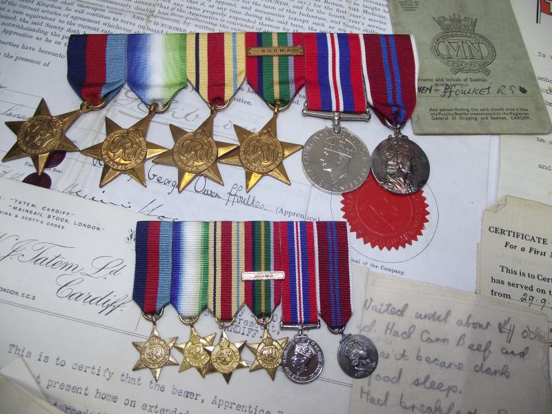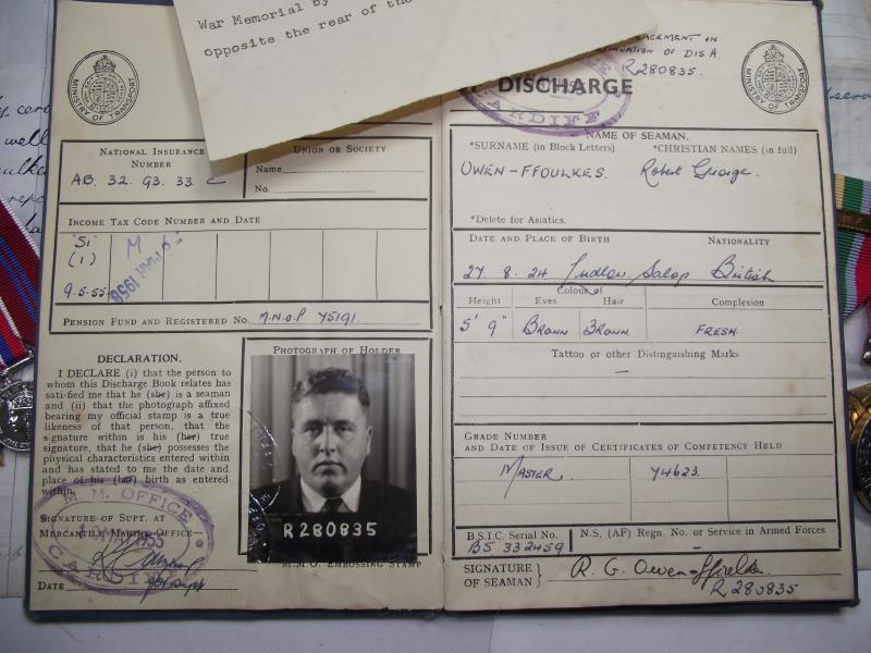 A very nice large grouping of paperwork and medals belonging to a R.G.Owen.FFoulkes from Newport Road, Cardiff. From what i can gather, FFoulkes signed his Apprentice Indenture with the Atlantic Shipping and Trading Company Ltd in 1940 serving on his first ship SS.Hadleigh. FFoulkes was on board the Hadleigh , part of convoy ET-14, when it was torpedoed and sunk with the loss of two crewmen by U-77. This sinking is mentioned in a couple of documents. FFoulkes then served his remaining wartime service on the Empire Service, one of the Empire class Merchant Vessels run by the MoWT. As with many ''Salts'' this merchant seaman carried on from ship to ship after the war, passing his Steamship Master Certificate in 1955 ending his service in the 1960's as a Captain. There is too much paperwork relating to his service during and after the war so im not going to be able to list it all but heres a small preview.. Apprentice Certificate, wartime and postwar record books, Master Certificate, letter from the Master of SS Empire Service concerning his time on board, letter for addition of ration cards after being Torpedoed and two hand written letters i think written by FFoulkes pre war when working at sea. His large group of mounted medals come with a photocopy of his entitlement including certificate for the Coronation Medal. I myself think this is a super group with plenty of research possibility and something that came my way from a friend who does local house clearance so new to the market and never in anyone's collection before!